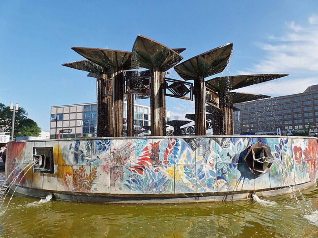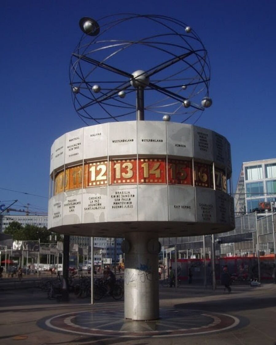 Non loin, la Weltzeituhr, ou horloge universelle, conçue par Erich John et également inaugurée en 1969, permet de connaître l’heure dans les principales capitales du monde, et est rapidement devenue un point de rencontre emblématique pour Berlinois et touristes.