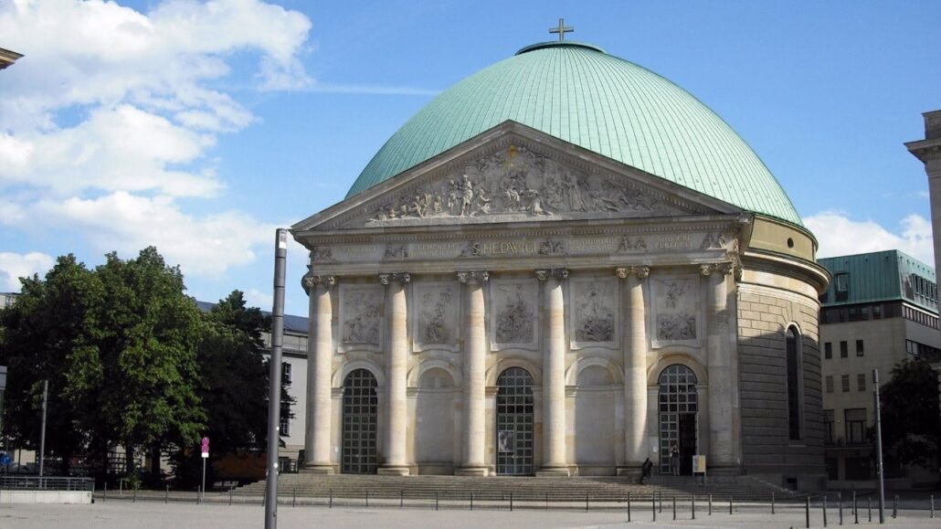 À quelques pas, la cathédrale Sainte-Hedwige impose une sobriété presque déroutante. Cathédrale catholique au milieu d’un environnement largement protestant, elle incarne une autre Berlin : discrète, minoritaire, mais profondément ancrée.