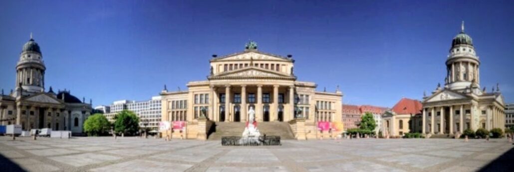 Nous passons par la Gendarmenmarkt, l’une des places les plus élégantes de Berlin, presque trop parfaite elle est encadrée par l’église allemande (Deutscher Dom), l’église française (Französischer Dom) et le Konzerthaus (salle de concerts), avec un monument à Friedrich Schiller en son centre.