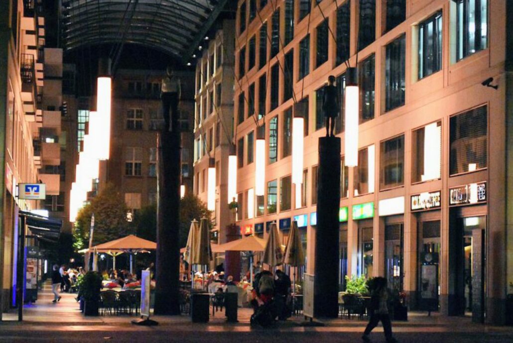 Les quelques tables disposées sous les arches donnent sur la rue, et l’ambiance est animée par les passants et les conversations des Berlinois et touristes qui circulent le long de la rue couverte.