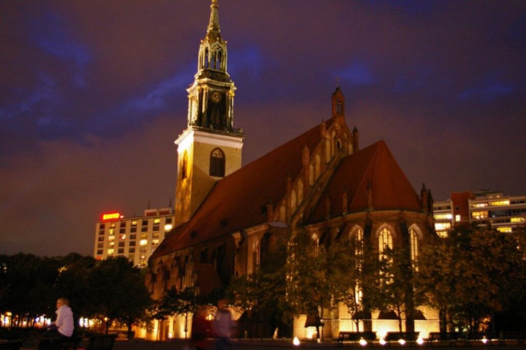 Nous retournons à Alexanderplatz et nous empruntons la Heiligegeistgasse, une petite allée piétonne entièrement recouverte par des arceaux, qui lui donne un caractère presque intime malgré le cœur animé de Berlin‑Mitte. La lumière des lampes se reflète sur les pavés humides et les façades des bâtiments, et l’air frais de novembre est adouci par la voûte qui surplombe la rue.