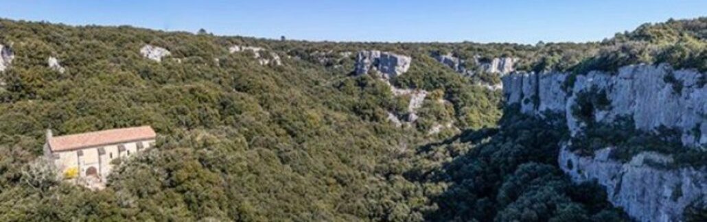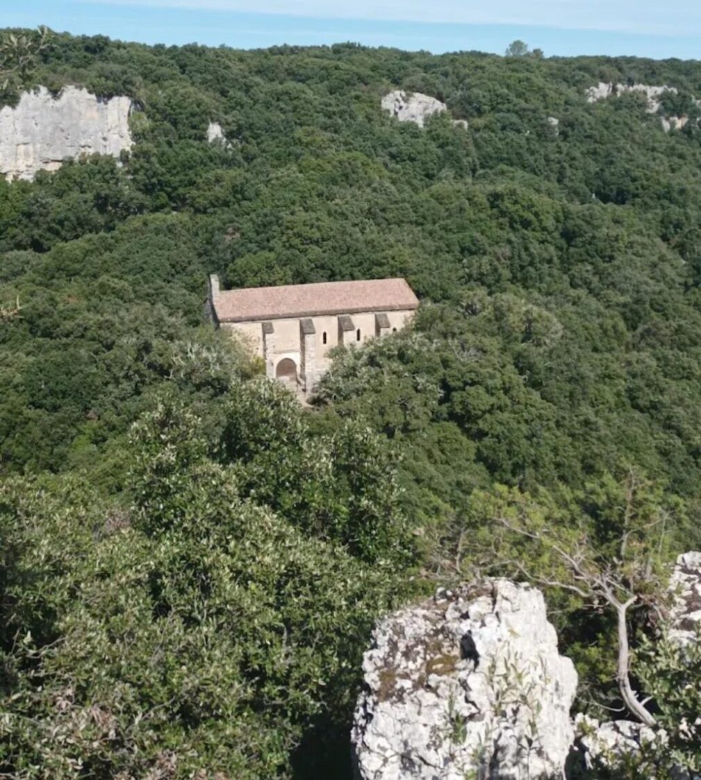 L’accès à l’église et au canyon se fait par une petite route puis un sentier facile. Tout au long du chemin, on croise de vieilles capitelles, ces abris de pierres sèches que les vignerons construisaient autrefois pour se protéger du vent ou du soleil. Certaines, encore bien conservées, se fondent dans la garrigue, d’autres ne sont plus que ruines couvertes de mousse. Elles rappellent la vie paysanne d’autrefois, quand chaque pierre du plateau servait à bâtir, à délimiter, à abriter.