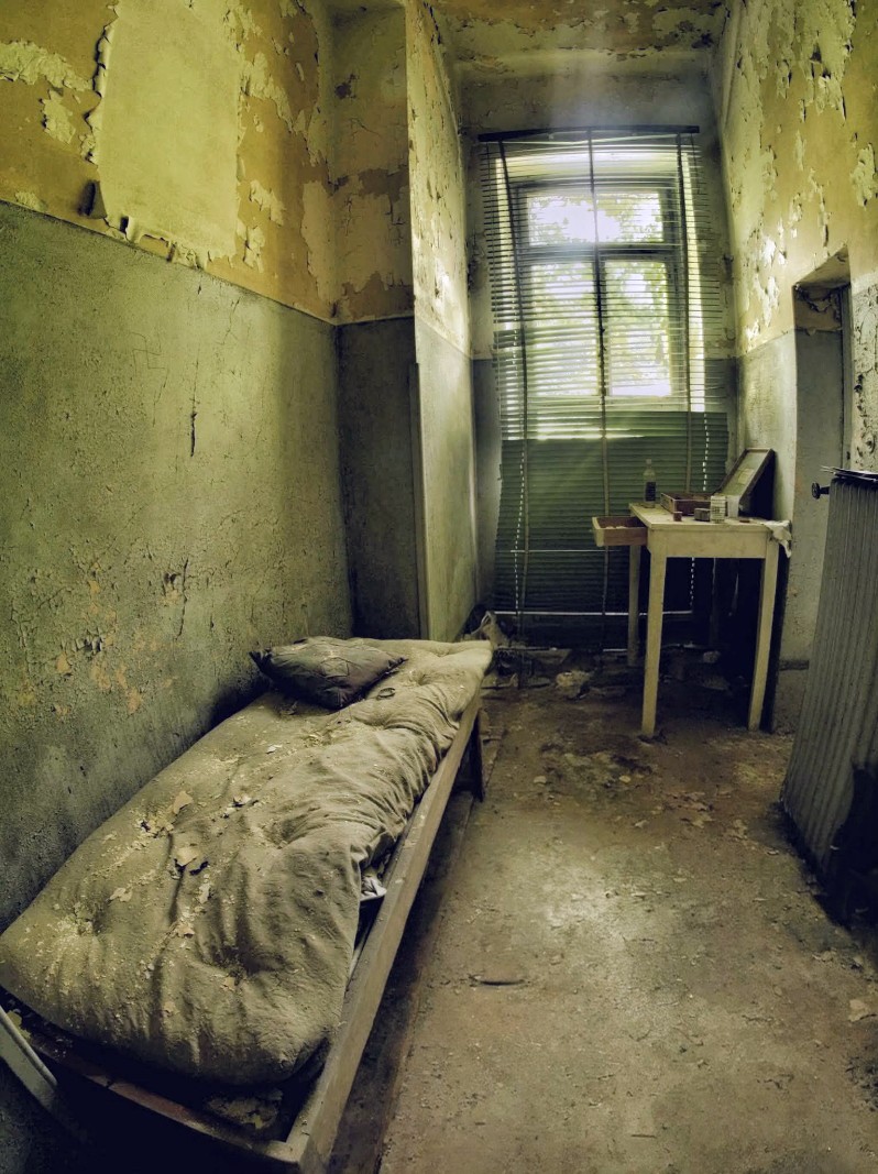 Et puis, il y avait l’immensité. Le site compte une vingtaine de bâtiments, tous semblables, disposés comme un petit village fantôme. Des ailes entières d’hôpital, reliées par d’interminables couloirs, bordés de cellules identiques. Les portes, désormais arrachées ou grandes ouvertes, formaient des enfilades de vides béants. À chaque pas, la même désolation, la même géométrie implacable.