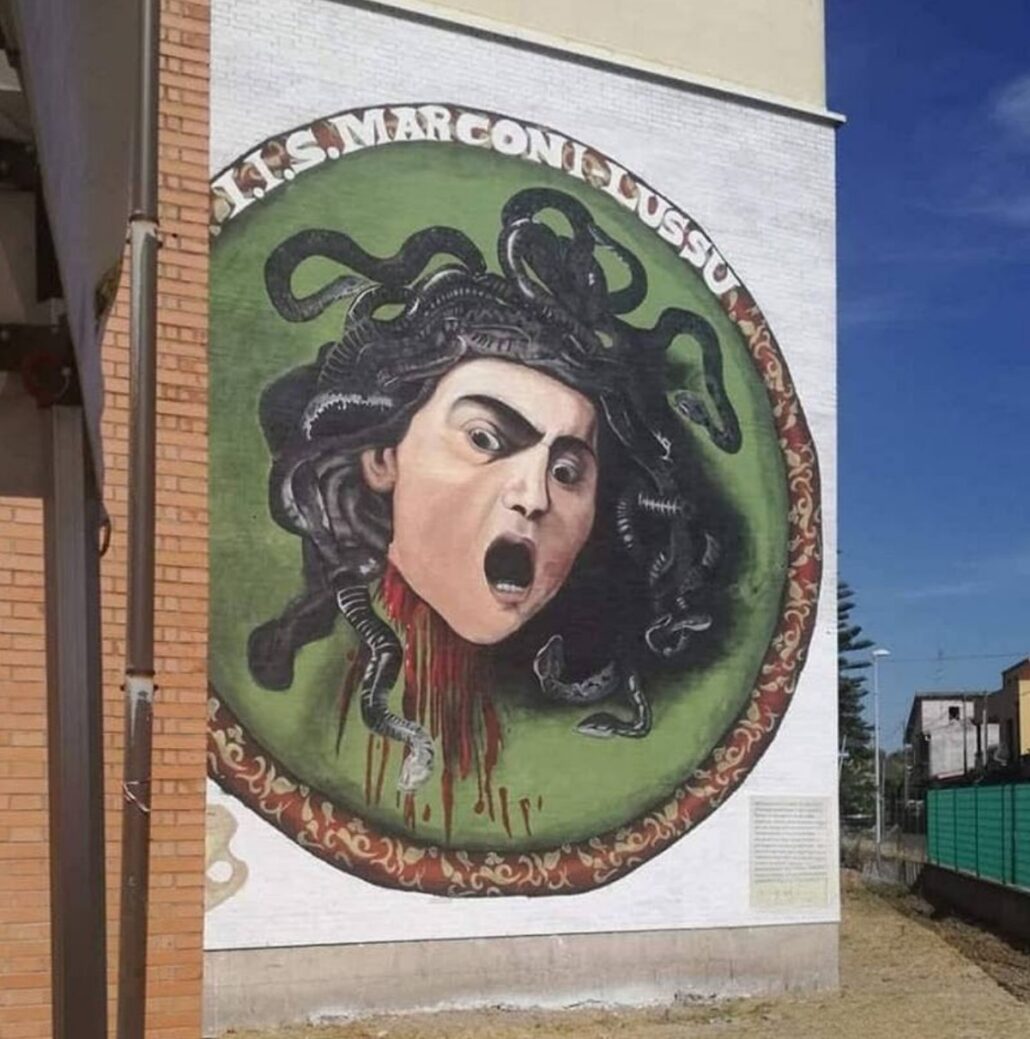 Une autre fresque la Méduse immense qui fixe les passants de son regard pétrifiant. Inspirée du Bouclier de Méduse peint par Le Caravage en 1597, cette fresque intitulée « Le Caravage débarque en Sardaigne » est un hommage au génie du clair-obscur et un pont entre Florence et la Sardaigne, où l’art quitte le musée pour vivre sur les murs et parler à tous.