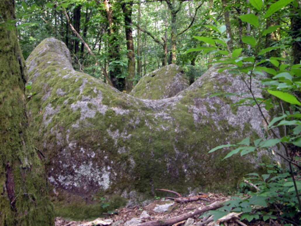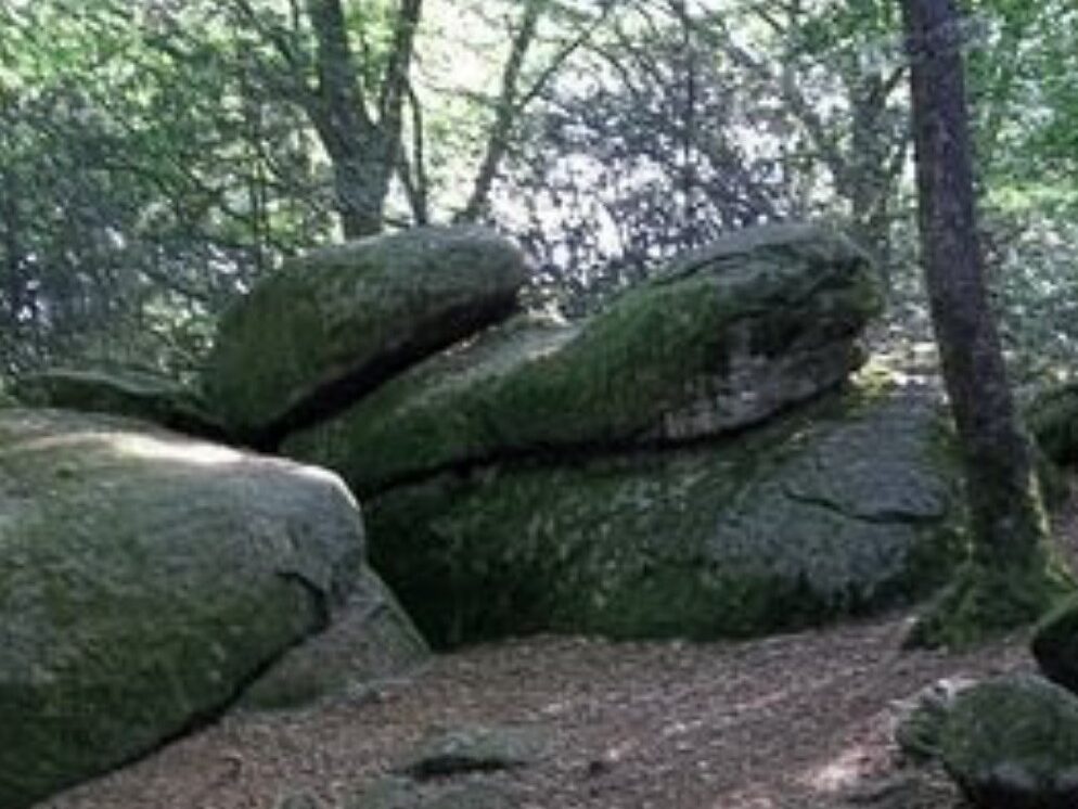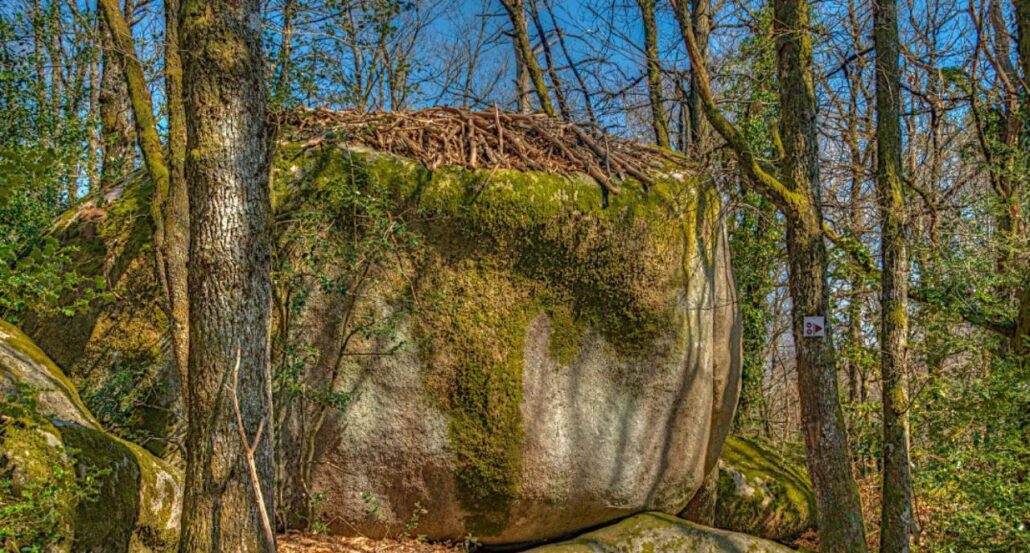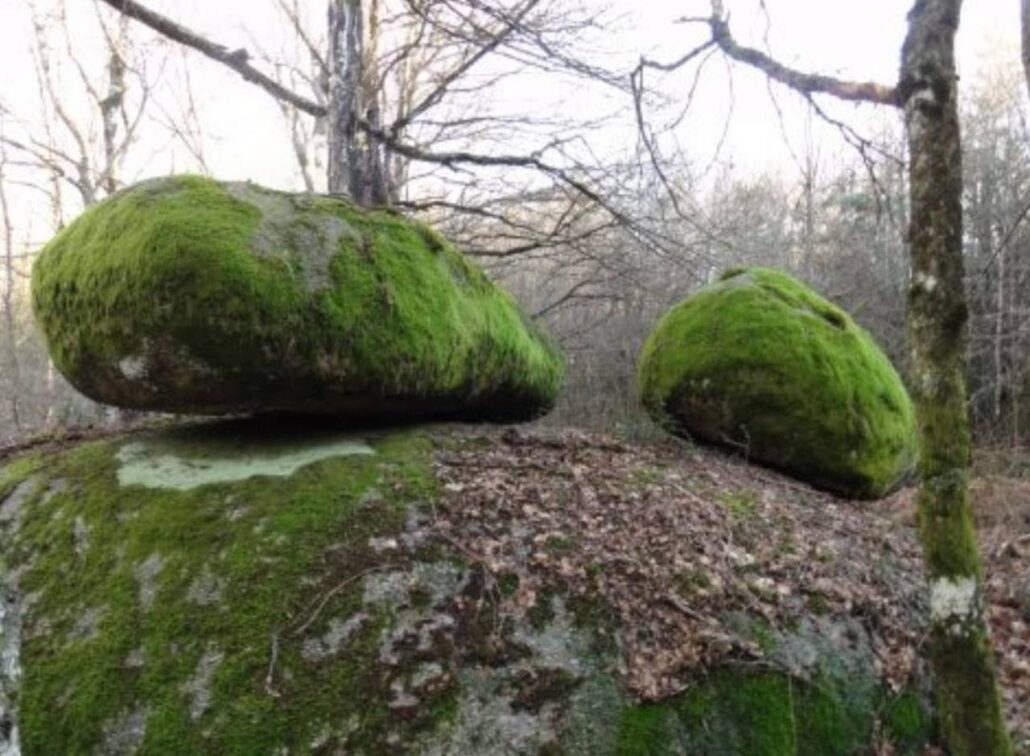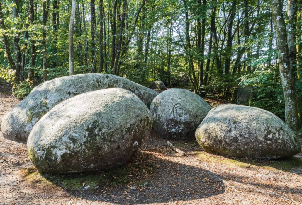 Au détour du chemin des Merveilles, trois énormes blocs de granit émergent de la mousse comme une ponte fossilisée. Leurs formes ovales, lissées par le temps et les pluies, évoquent irrésistiblement des œufs de dinosaures figés depuis des millions d’années.