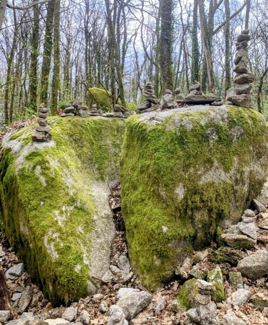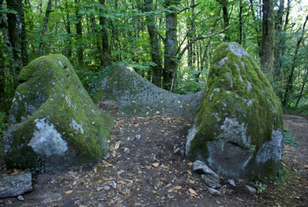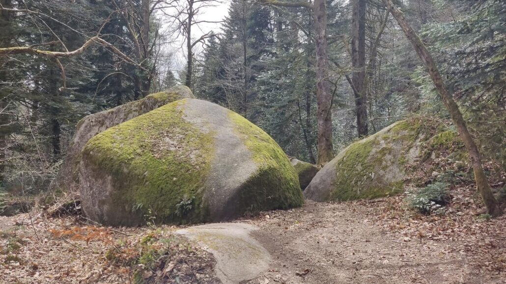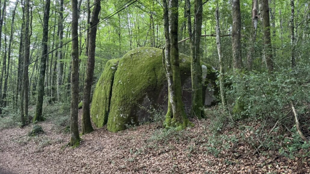 Au détour du chemin des Merveilles, trois énormes blocs de granit émergent de la mousse comme une ponte fossilisée. Leurs formes ovales, lissées par le temps et les pluies, évoquent irrésistiblement des œufs de dinosaures figés depuis des millions d’années.