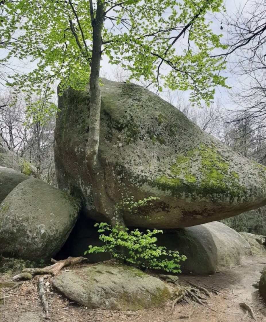 Sa surface bombée, striée comme une coquille, évoque la carapace d’une tortue géante endormie depuis des siècles. Certains disent qu’elle avance d’un pas imperceptible chaque nuit, glissant lentement vers la vallée. D’autres y voient simplement un chef-d’œuvre du temps, une tortue de granit figée entre rêve et réalité.