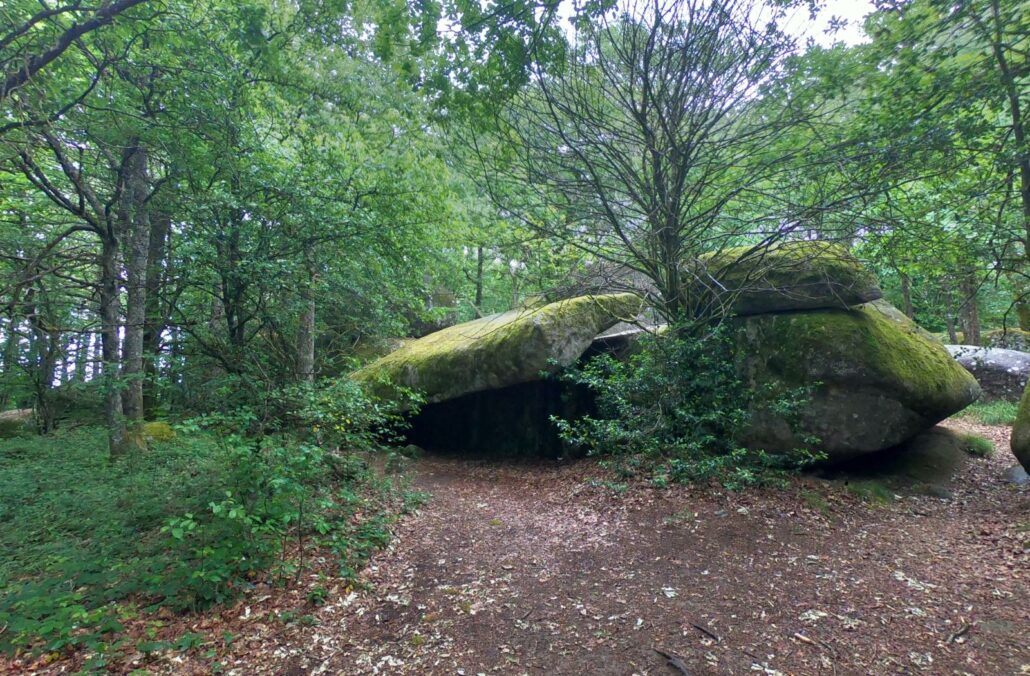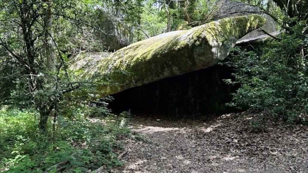 Sous une large dalle de granit, au milieu du chemin, s’ouvre un passage sombre.