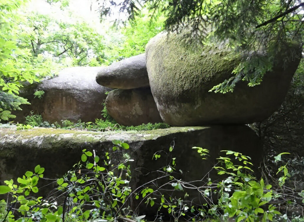 Au détour du chemin des Merveilles, trois énormes blocs de granit émergent de la mousse comme une ponte fossilisée. Leurs formes ovales, lissées par le temps et les pluies, évoquent irrésistiblement des œufs de dinosaures figés depuis des millions d’années.