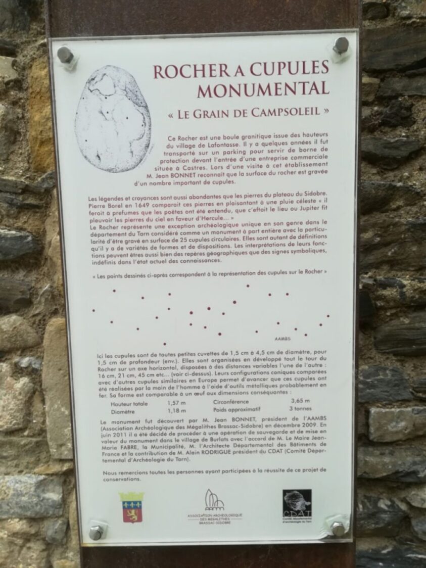 Aujourd’hui, le rocher est installé à l’extérieur, près de l’entrée de la mairie de Burlats, où il peut être observé librement.