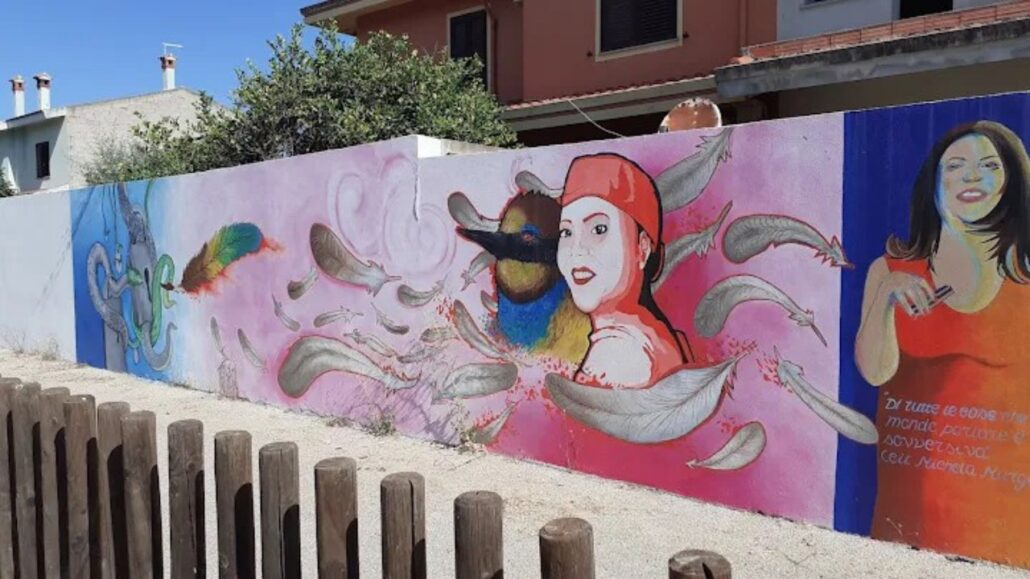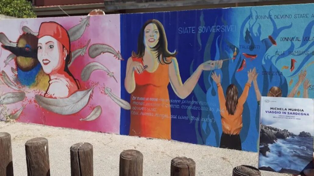 Le murale le rappelle clairement. En arrière-plan, on reconnaît l’étang de Cabras et la chiesa di Santa Maria, paysages familiers de son enfance. Rien d’abstrait ici : la pensée de Michela Murgia s’enracine dans un territoire précis, avant de s’adresser au monde entier.