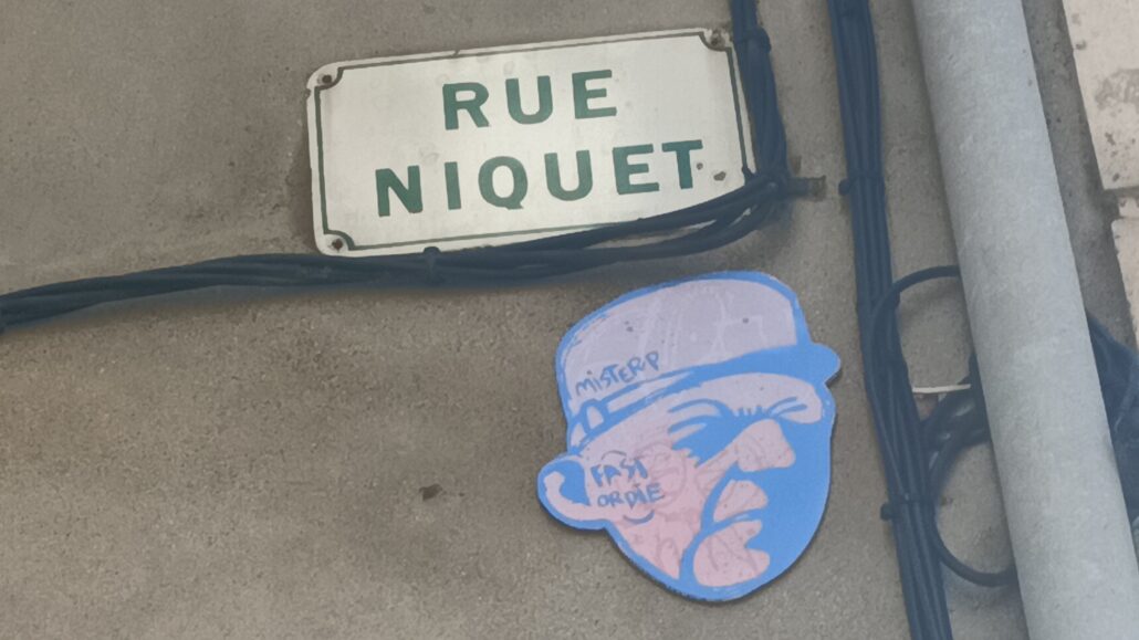 Ce qui suit n’est que mon interprétation. Le street art ne fournit jamais de mode d’emploi ; il pose des signes, des fragments, et laisse au passant le soin de les relier. Rue Niquet, à Narbonne, un collage m’a pourtant retenu plus longtemps que d’ordinaire. Sur un mur discret apparaît un visage immédiatement identifiable : celui du maréchal Pétain, réduit à une caricature, presque figée dans une expression hors du temps. Le képi, les traits vieillis, l’ironie sèche de l’inscription « Mister P ». Sur la joue, comme une balafre, deux mots sans détour : FAST ORDIE. Le slogan détourne manifestement l’expression anglaise « fast or die » — avancer…