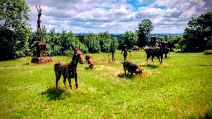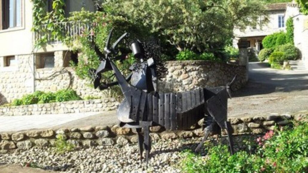 Quand on parcourt le sud de la France, on croise parfois, au détour d’une route ou d’un vallon, les silhouettes de métal d’André Debru. Mais c’est sur les routes du Larzac et de l’Aveyron que sa faune accomplît sa grande transhumance immobile, telle une caravane figée de créatures familières et fantastiques, veillant silencieusement sur les voyageurs. Nous quittons le gîte « Le sécadou » à proximité de la Notre-Dame-du-Désert direction le village des Costes-Gozons situé à une dizaine de kilomètres Rendons visite à André Debru, ce génial ferronnier d’art qui semble avoir conclu un pacte secret avec le fer pour lui insuffler vie, mouvement et une irrésistible présence. Il habite le village…