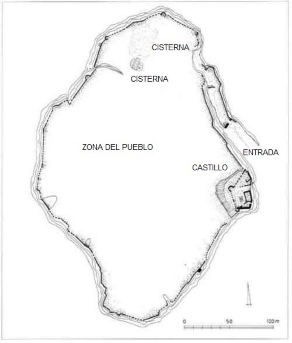 Le village s’étendait à l’intérieur des remparts, au Nord. Il existe toujours les citernes, qui sont deux vastes trous creusés à même la roche et maçonnées en voûte sur le dessus. L’énorme capacité de ces deux citernes donne une idée du fait que l’eau était probablement une denrée rare par ici, ce que confirme la géologie locale.