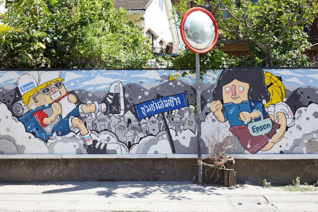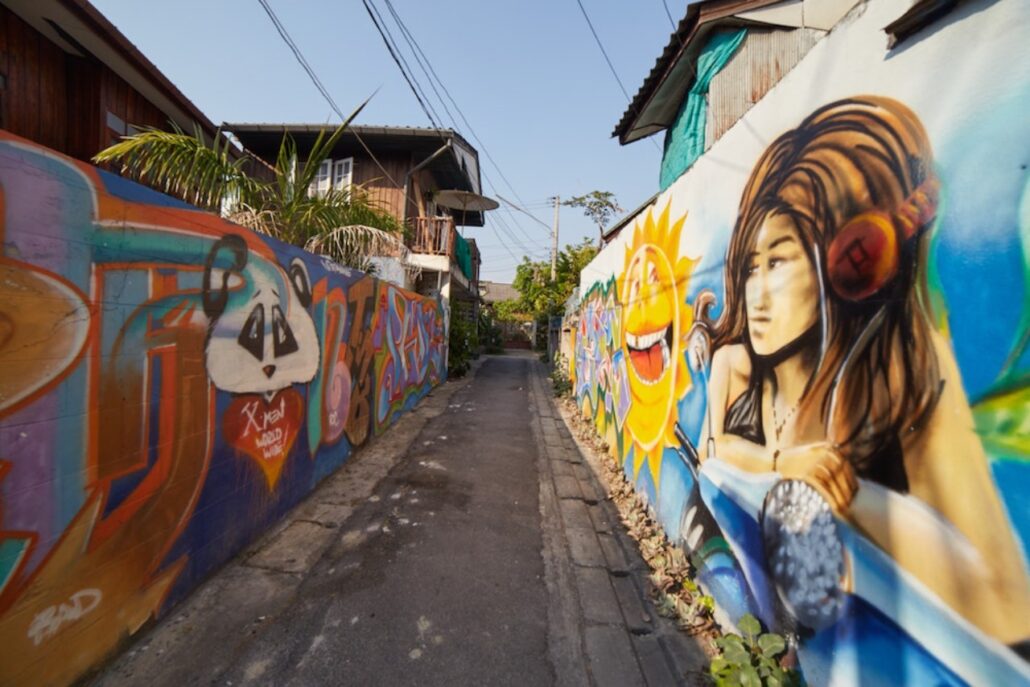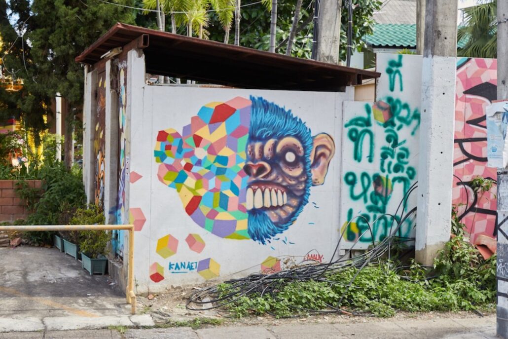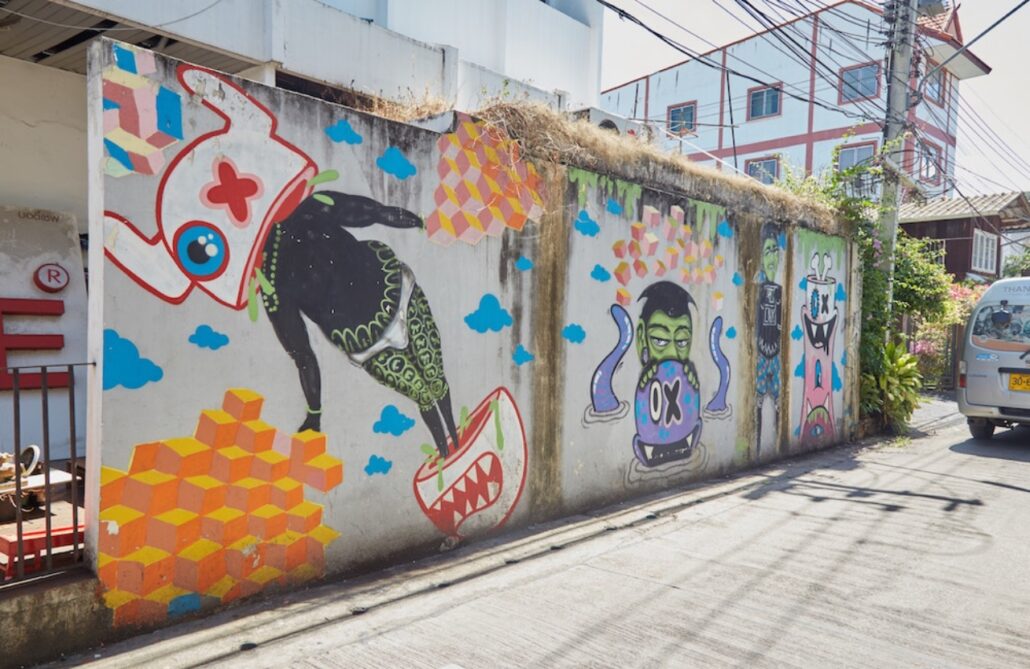 Dans la vieille ville, le street art se cache souvent dans les petites ruelles et sur les façades discrètes. Près de Tha Phae Gate, on peut croiser des fresques aux couleurs vives qui attirent l’œil des passants. Du côté des cafés branchés et des guesthouses, notamment le long de Ratchadamnoen Road ou dans les rues secondaires comme Moon Muang Soi 9, les murs se parent de dessins originaux, parfois signés par des artistes locaux ou étrangers de passage.