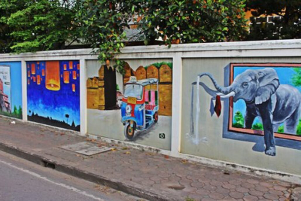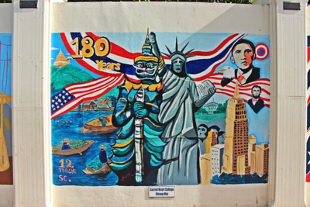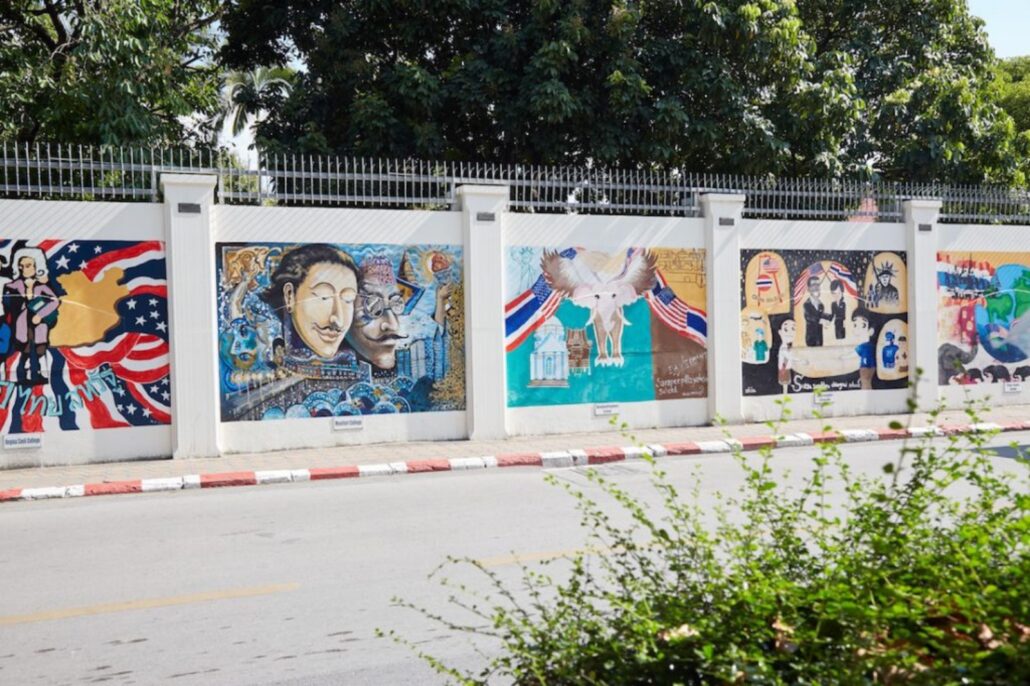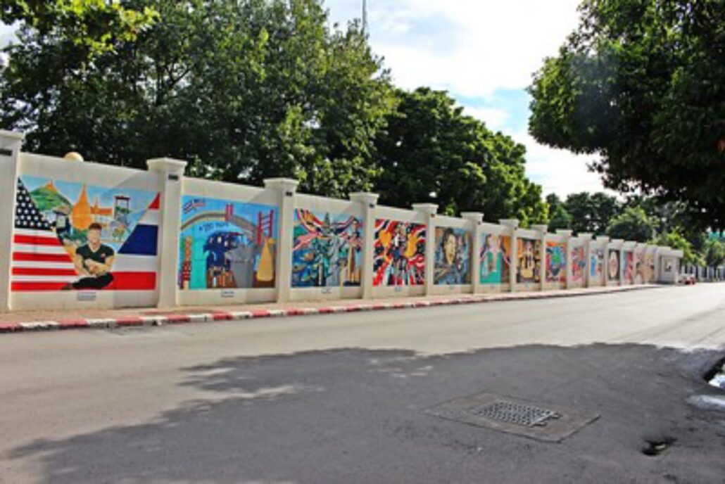 Dans la partie est de la ville se trouve également le consulat des États-Unis, à l’extérieur duquel se trouve une collection de peintures murales dédiées aux relations diplomatiques entre les États-Unis et la Thaïlande.