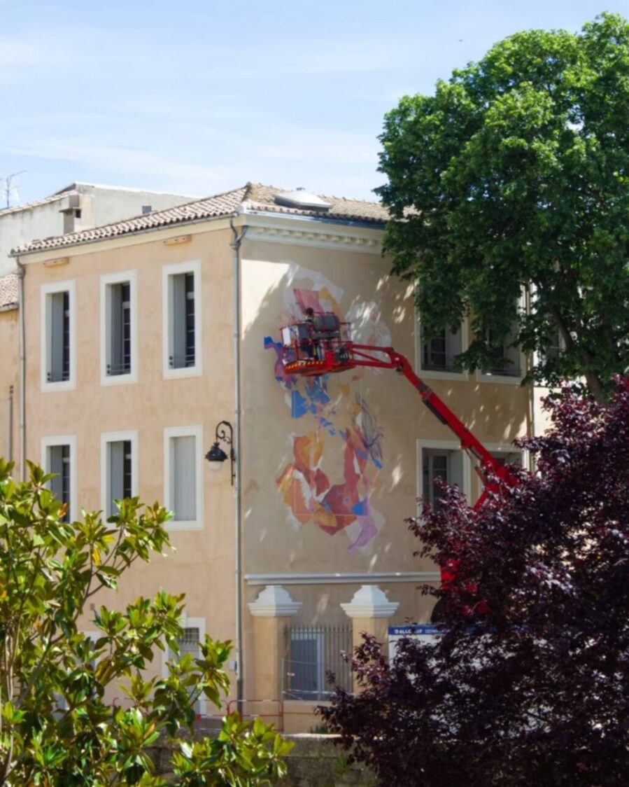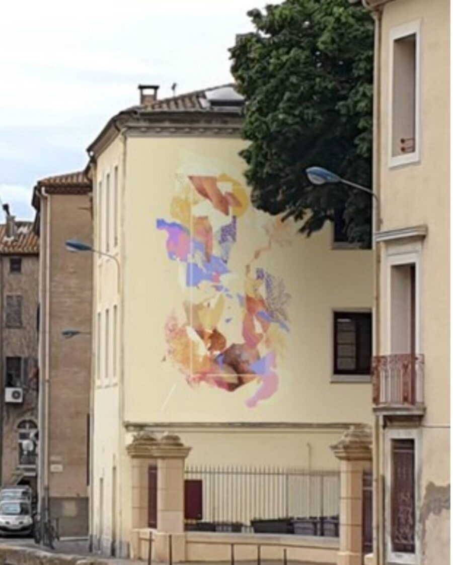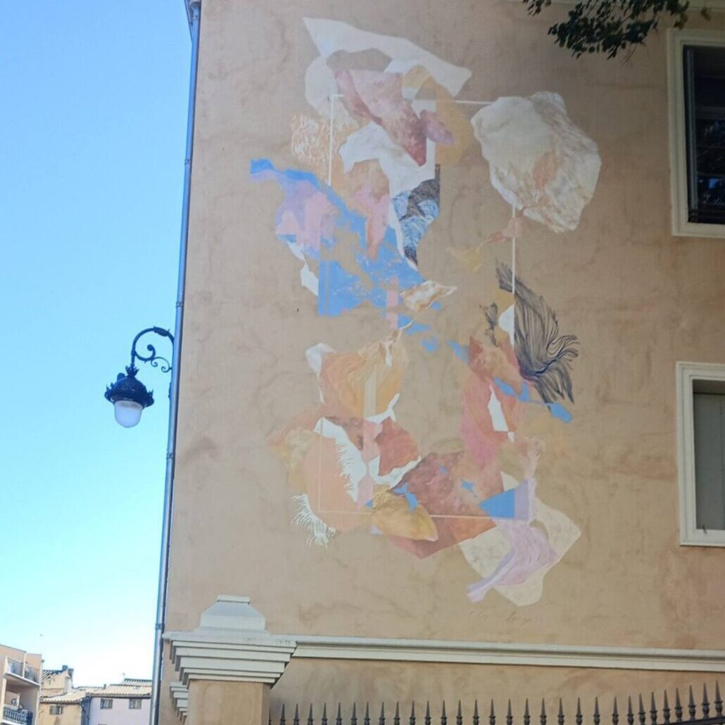 À première vue, certains ont cru que la fresque s’effaçait déjà. En réalité, ce n’est pas une disparition, mais un choix esthétique : couleurs claires, transparences, formes fragmentées. La fresque ne cherche pas à occuper le mur, elle le laisse respirer. Elle est discrète, presque fragile, changeante selon la lumière et le regard.