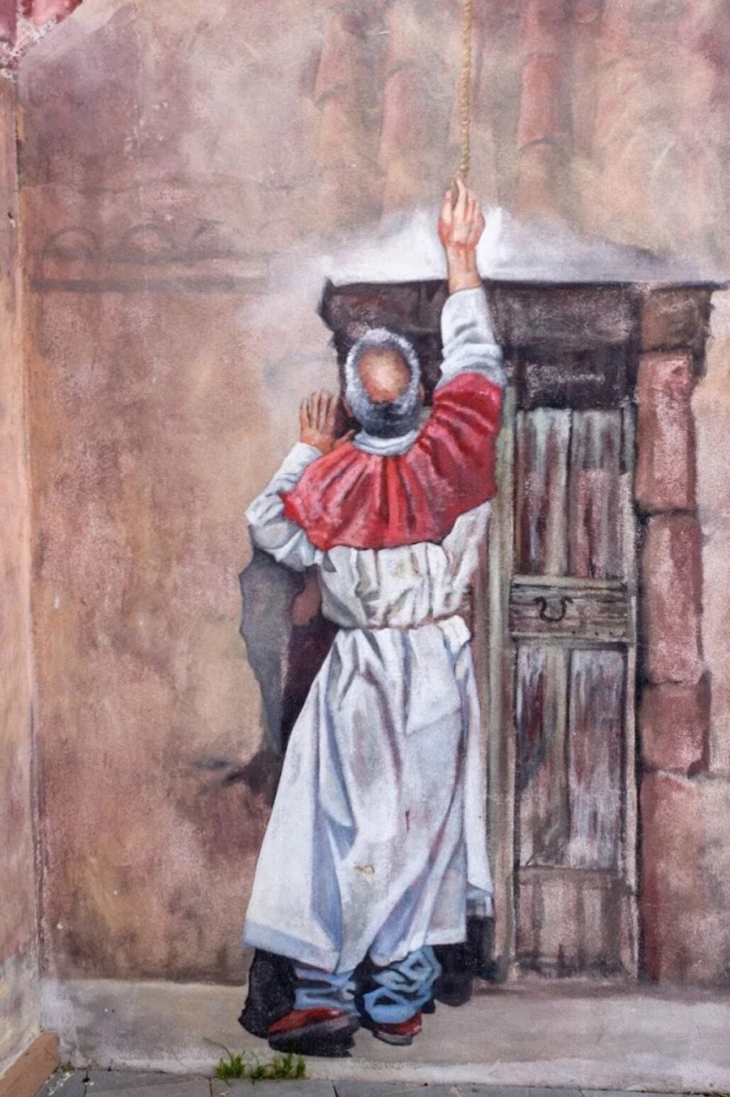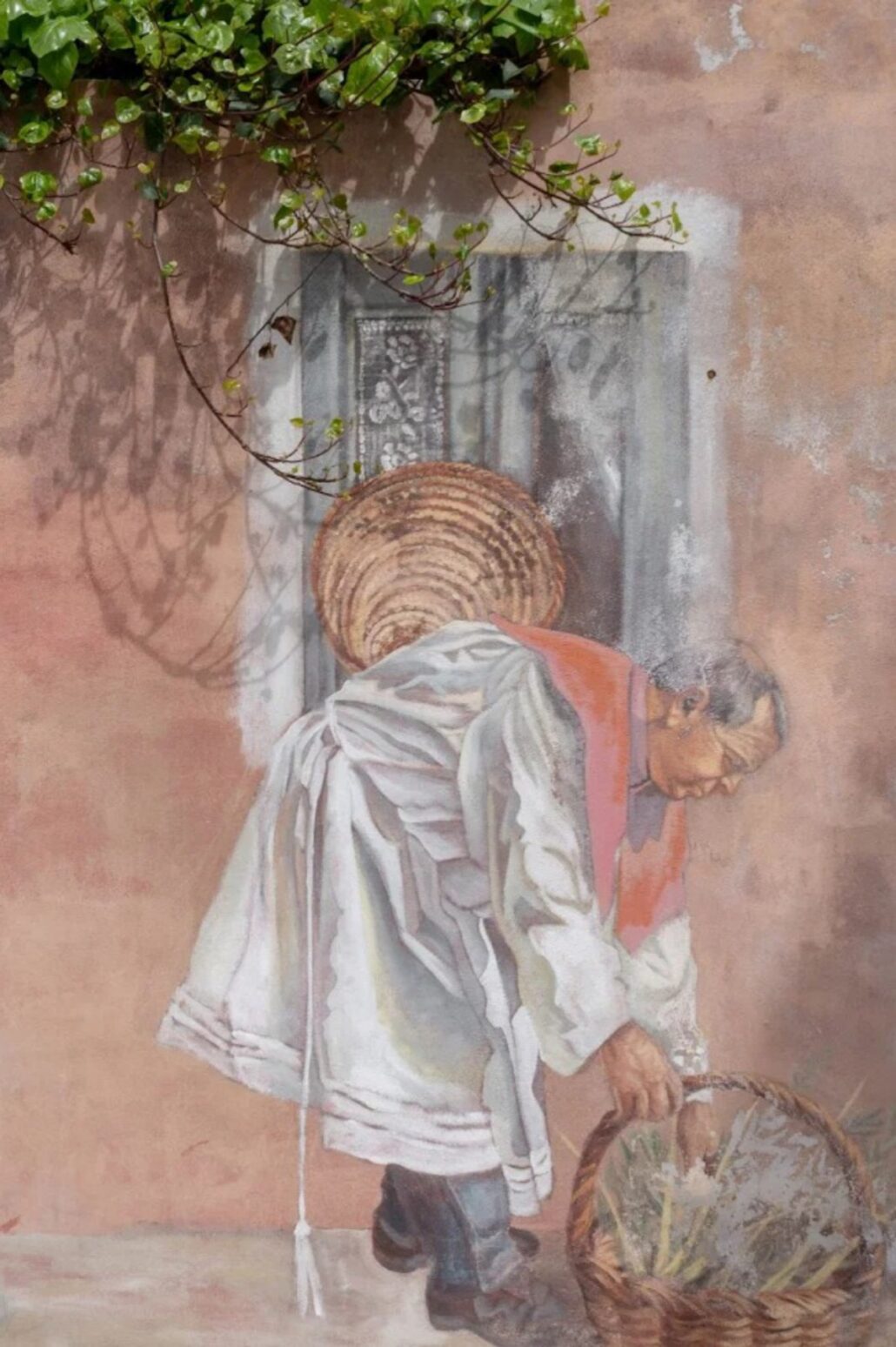 Si Flussio n’offre pas la même profusion de peintures murales que sa voisine Tinnura, il n’en possède pas moins un petit trésor. Sur une place du centre, quelques fresques anciennes racontent, à leur manière, la vie et l’âme du village. La qualité picturale y est remarquable : les personnages, simples et réalistes, semblent faire corps avec le décor. Les peintures ne se contentent pas d’orner les murs — elles dialoguent avec la rue, avec ceux qui passent, comme si elles faisaient partie intégrante du quotidien.
