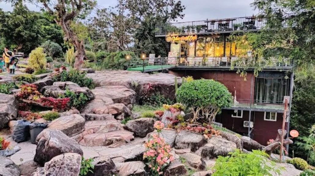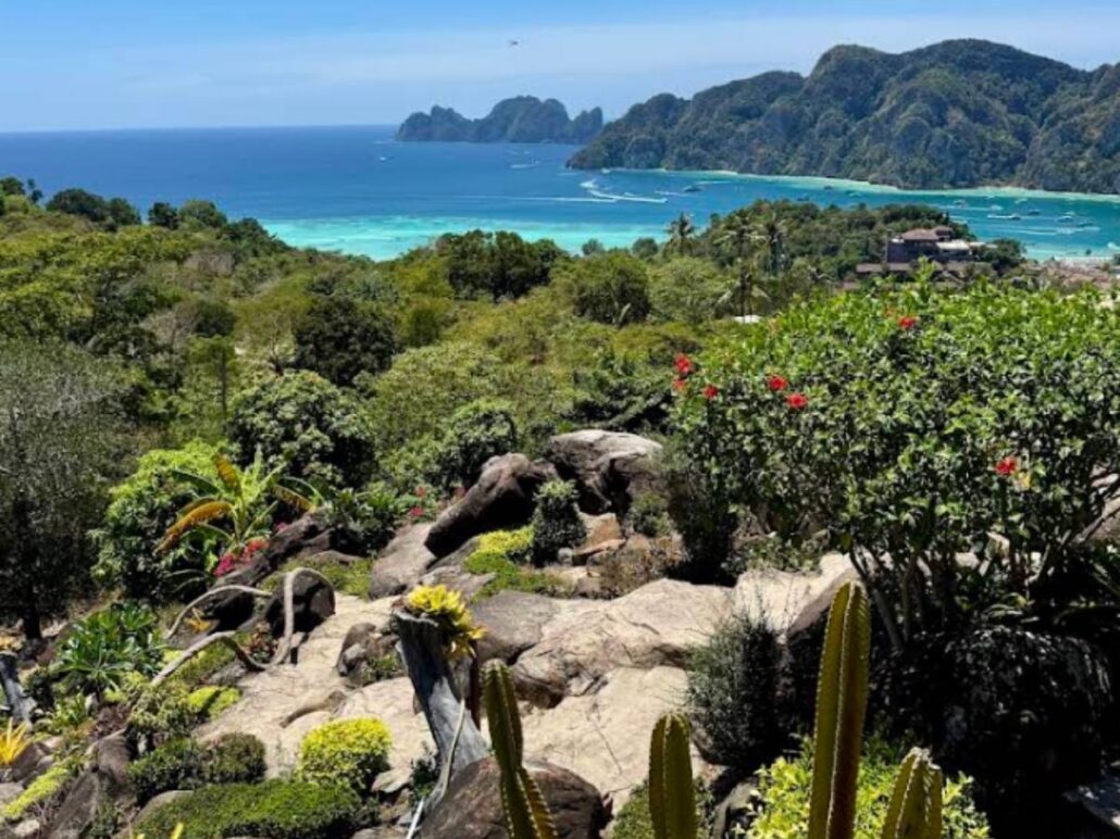 Le premier point de vue n’est pas seulement une étape : c’est déjà un vrai belvédère. Installé dans un jardin botanique aménagé, avec bancs fleuris, statues et fruits géants en décoration, il offre une belle introduction à la géographie si particulière de Phi Phi.