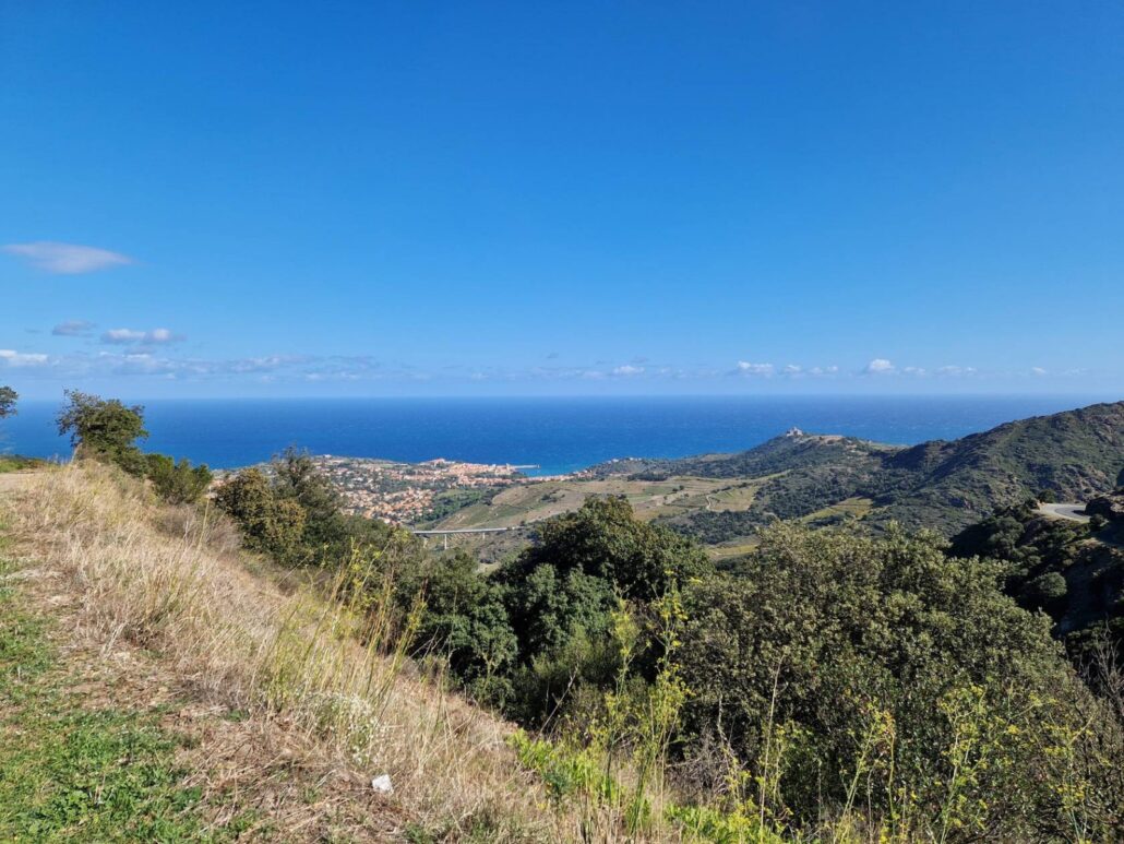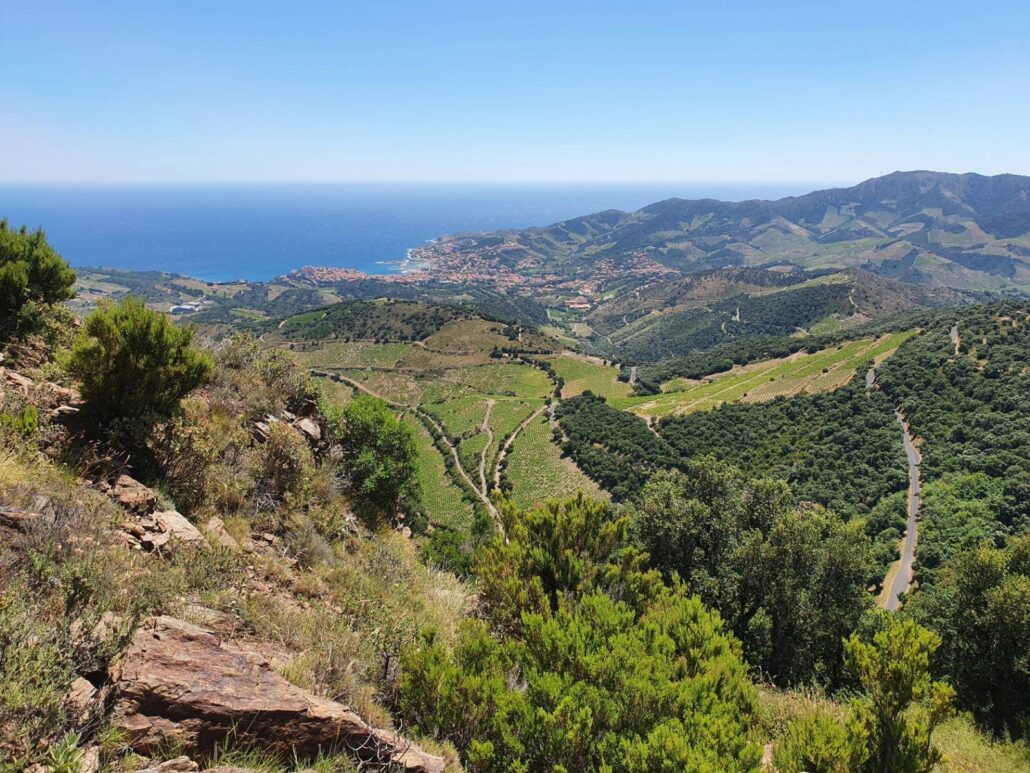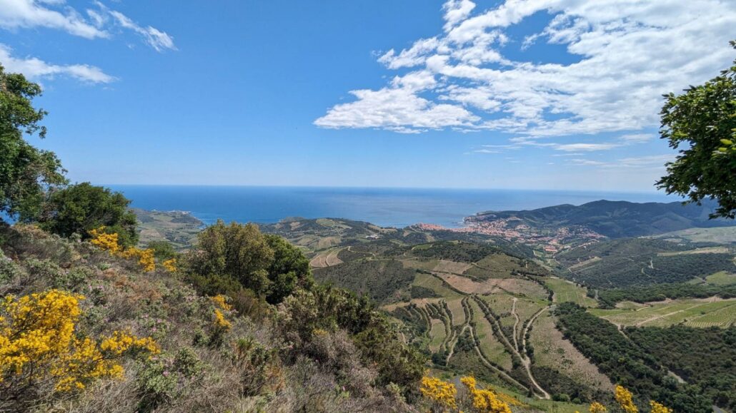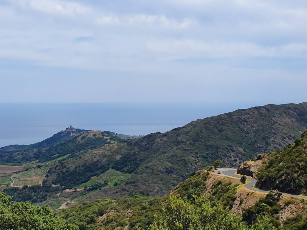 À chaque virage, un tableau : d’un côté, la Côte Vermeille, ses criques turquoise et ses ports tranquilles ; de l’autre, les vignes qui grimpent, obstinées, jusqu’aux crêtes.