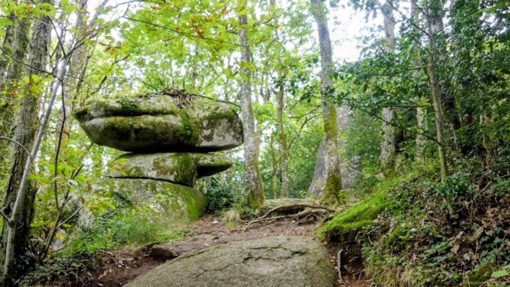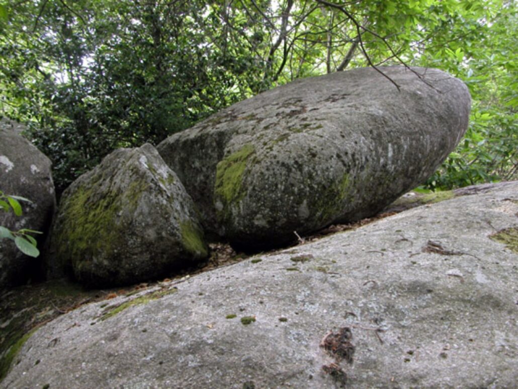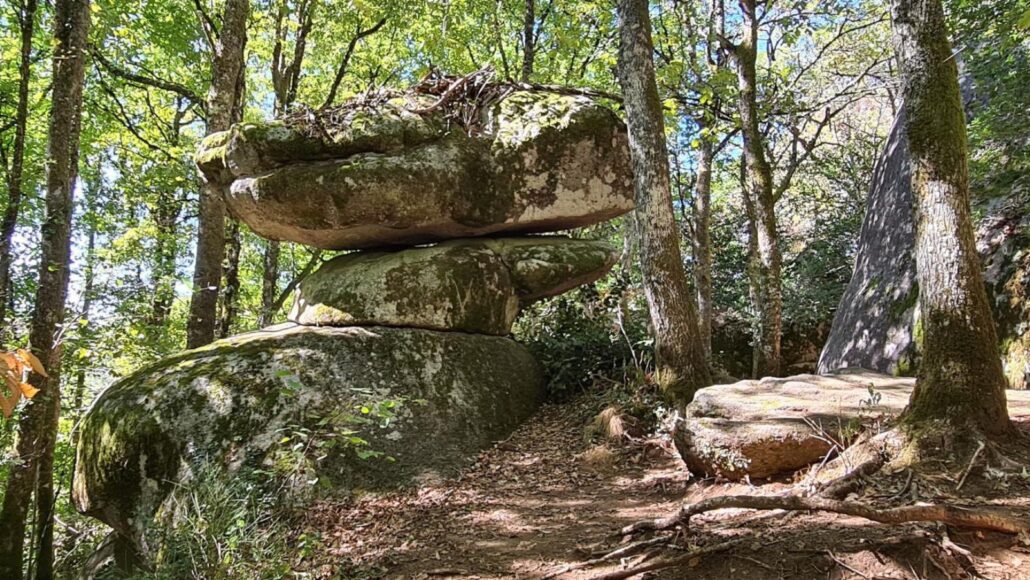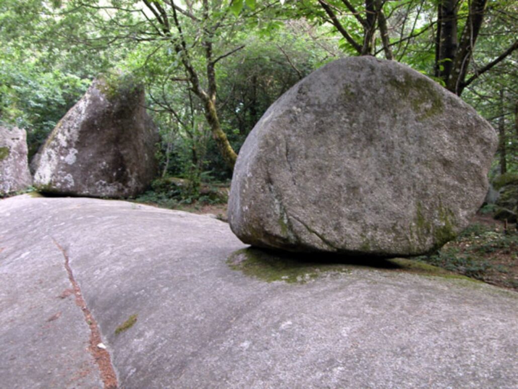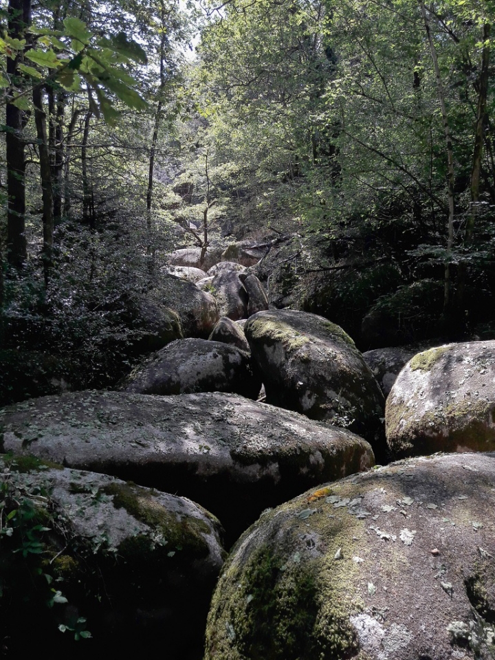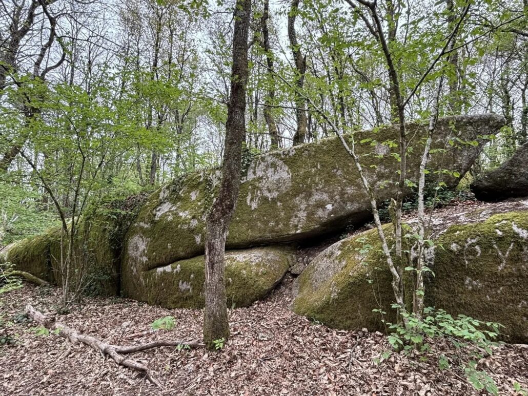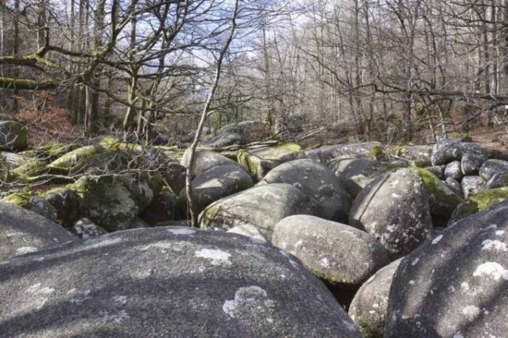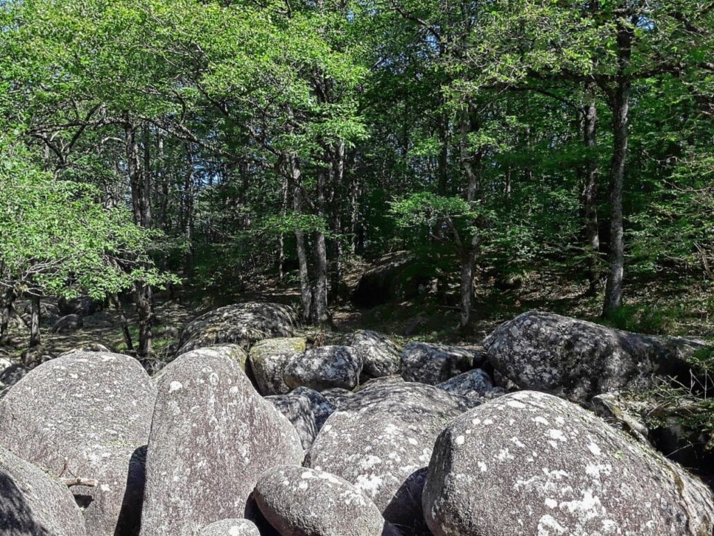 Sous les chênes et les pins, les pierres se dressent, s’empilent ou s’enchevêtrent, parfois couvertes de mousse, parfois fendues par les racines d’un arbre téméraire.