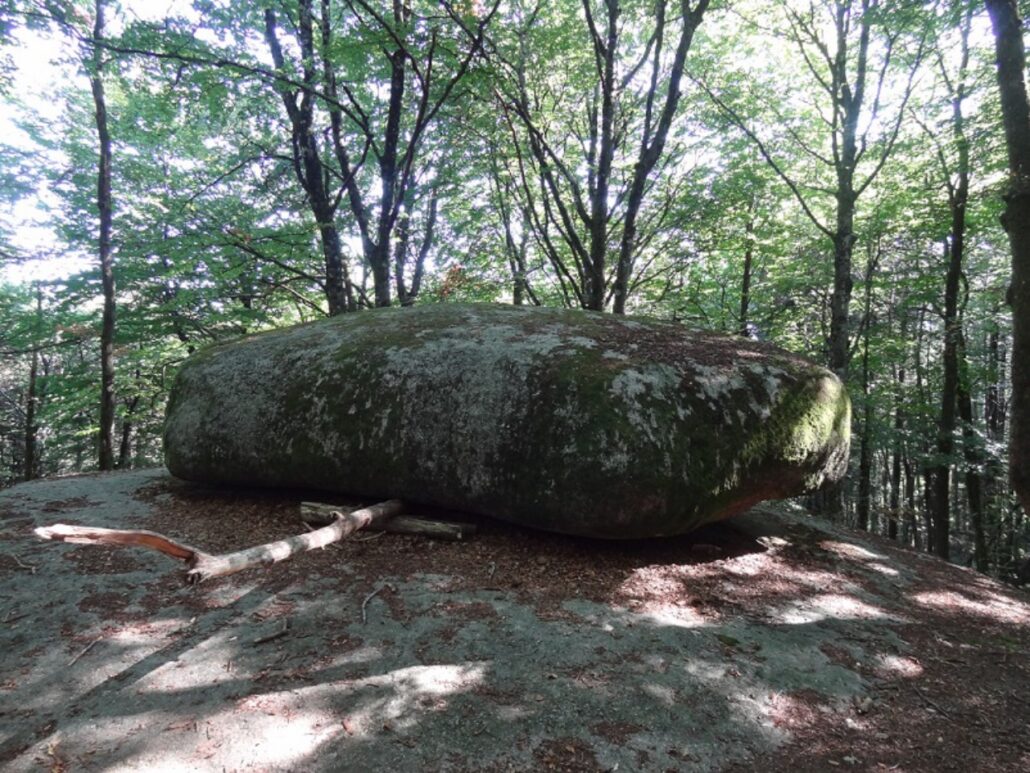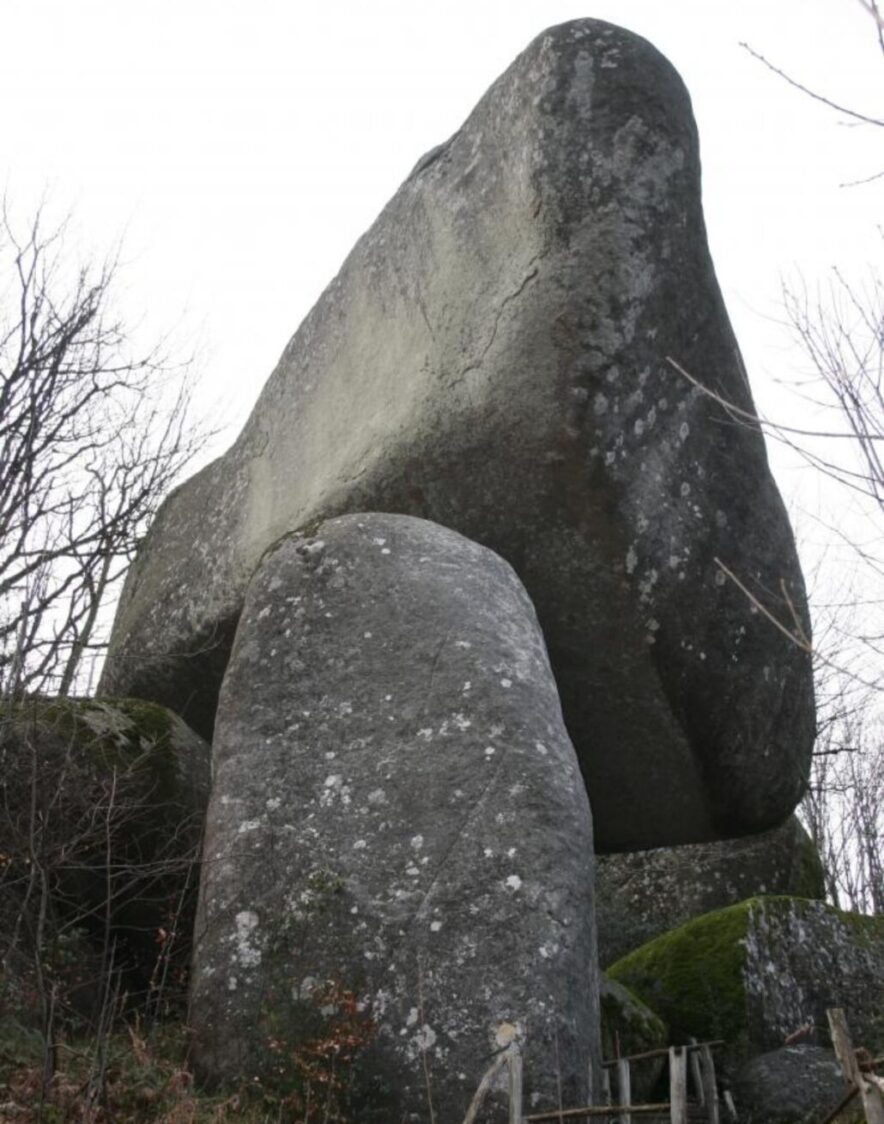 Située sur le Pic des Fourches (dont la croix des carriers en marque l’emplacement), cette pierre qui pèse environ 780 tonnes repose sur un socle d’un mètre carré. Une autre pierre en forme de cale façonnée par l’érosion entre le bloc et le socle assure l’ équilibre de l’ensemble.