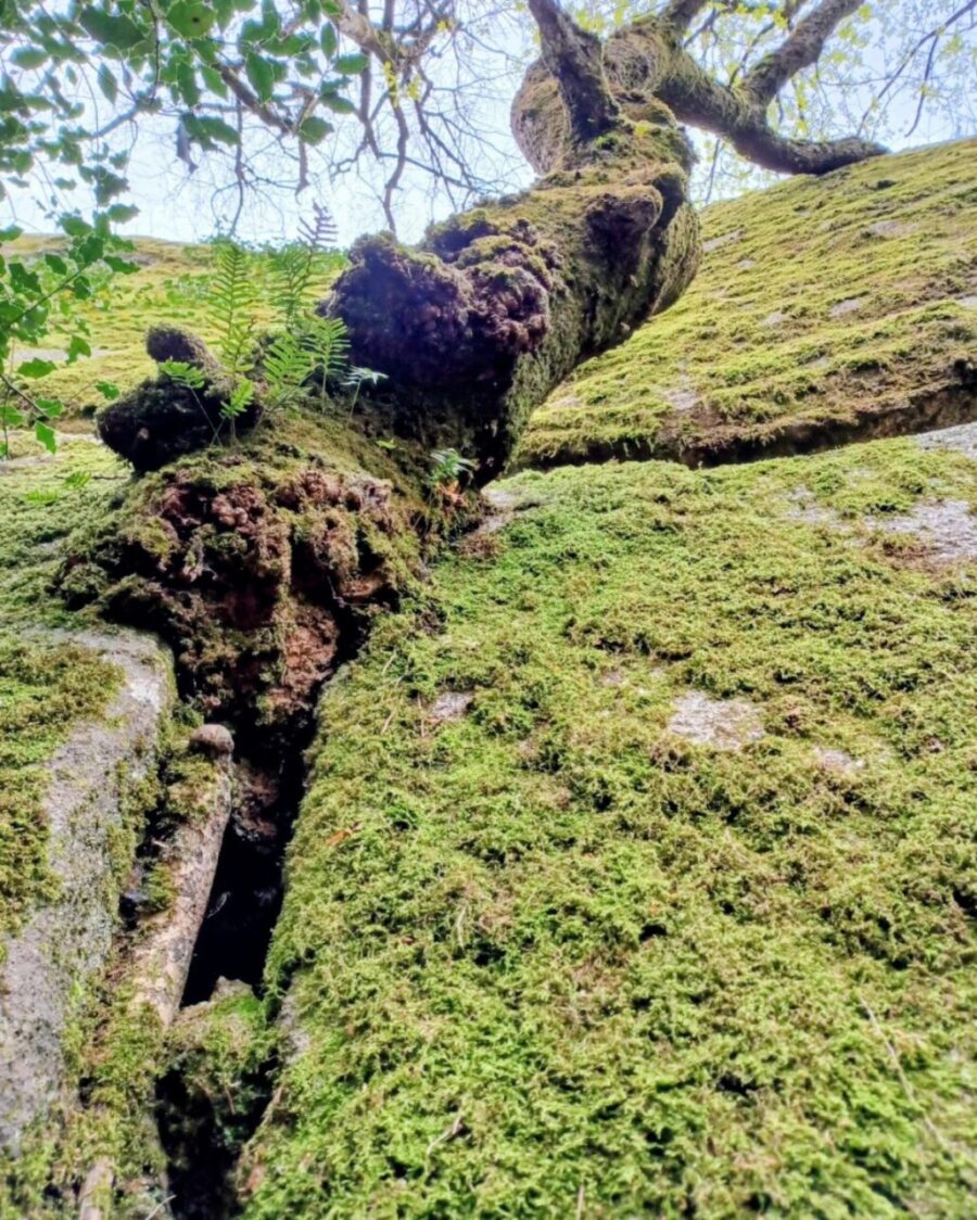 Mais aussi des arbres qui jaillissent des pierres, où le végétal et le minéral se mêlent intimement, unis par la mousse et le temps.