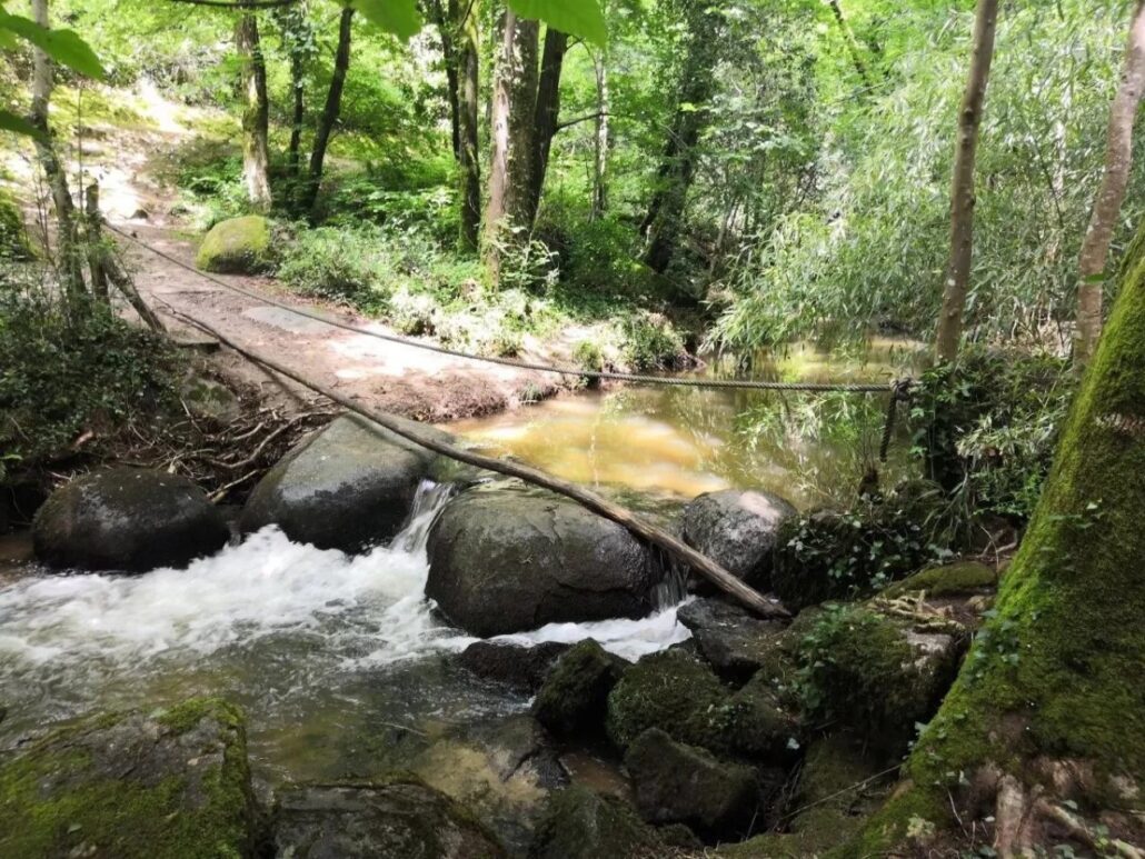 Un peu plus loin, la traversée du ruisseau devient un vrai jeu d’équilibre : pierres glissantes, branche en guise de balancier et corde pour se tenir. Fous rires garantis !