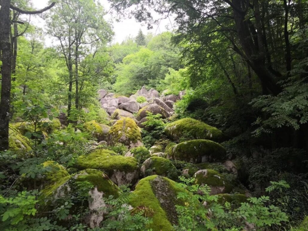 Le sentier serpente entre les blocs colossaux, souvent à l’ombre d’une forêt dense.