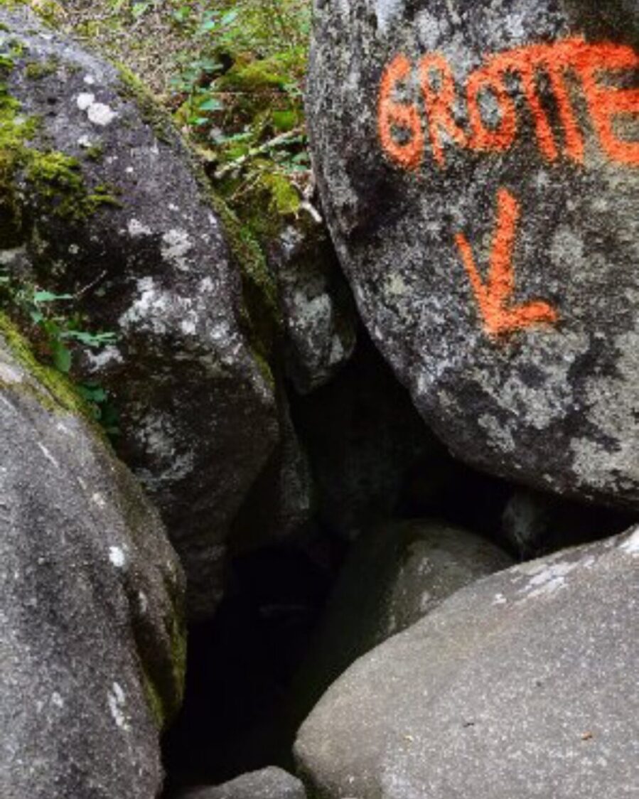 Entre les troncs moussus, on devine l’entrée de la grotte : étroite, presque invisible, indiquée par une grande flèche peinte sur la roche.