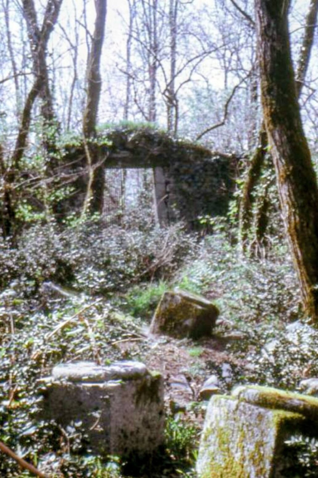 Entre les troncs moussus, on devine l’entrée de la grotte : étroite, presque invisible, indiquée par une grande flèche peinte sur la roche.