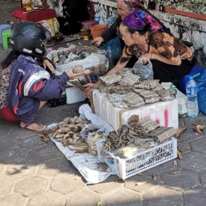Sur une longueur d’environ 250m, ce marché foisonne d’activité ! On y trouve des denrées atypiques comme du sang de bœuf en cubes gélatineux, des oeufs couvées, de la chauve-souris, du serpent, des insectes grillés (vers, sauterelles, grillons, larves d’abeille, chrysalides de papillons), des abats ou les mouches festoyent, des têtes de porc au caramel et une multitude de plantes et de feuilles utilisées dans la cuisine traditionnelle.