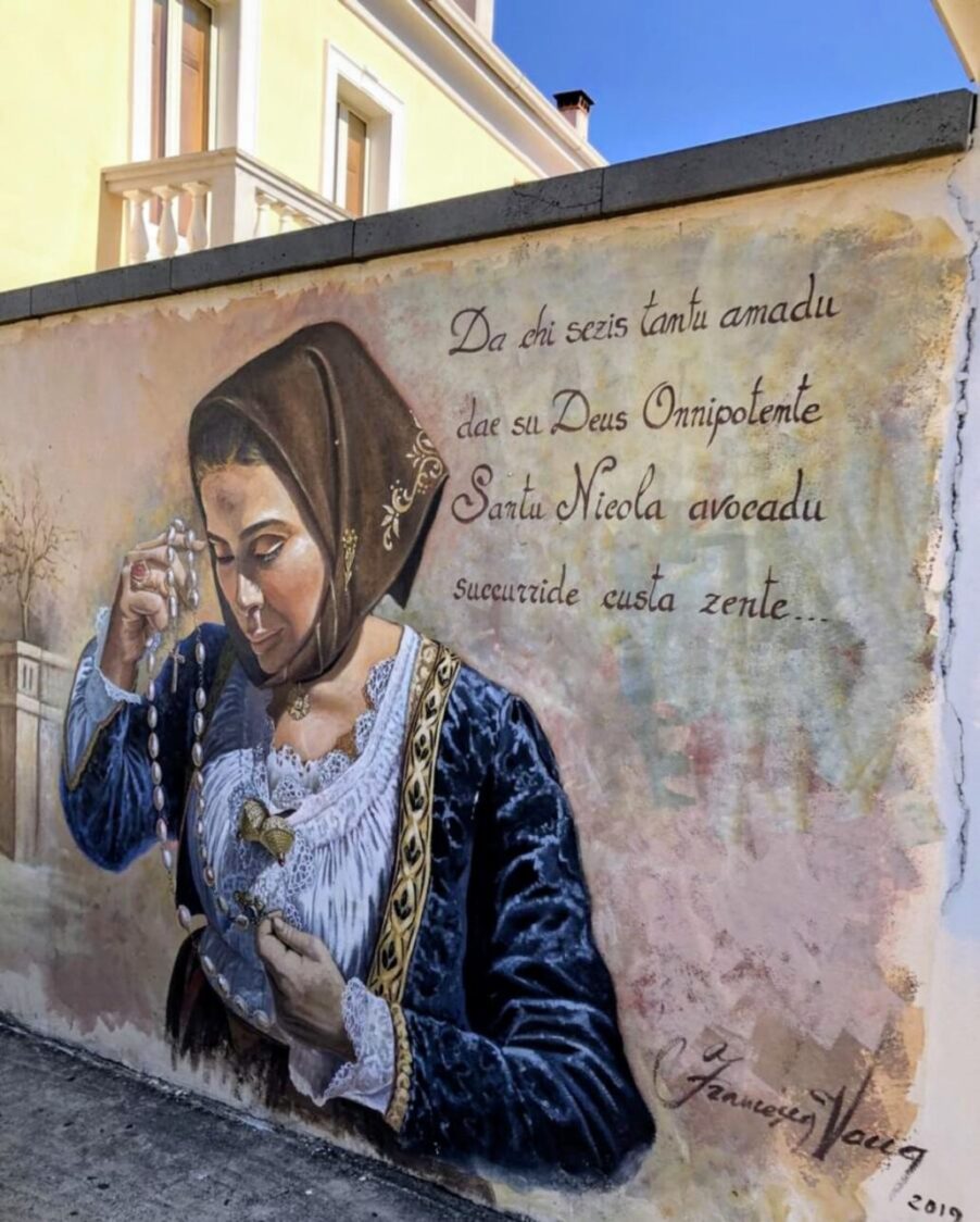 - Les figures féminines : de nombreuses fresques mettent en avant les femmes sardes, gardiennes des traditions et piliers de la famille. Elles apparaissent souvent dans leurs habits traditionnels, brodés et colorés.