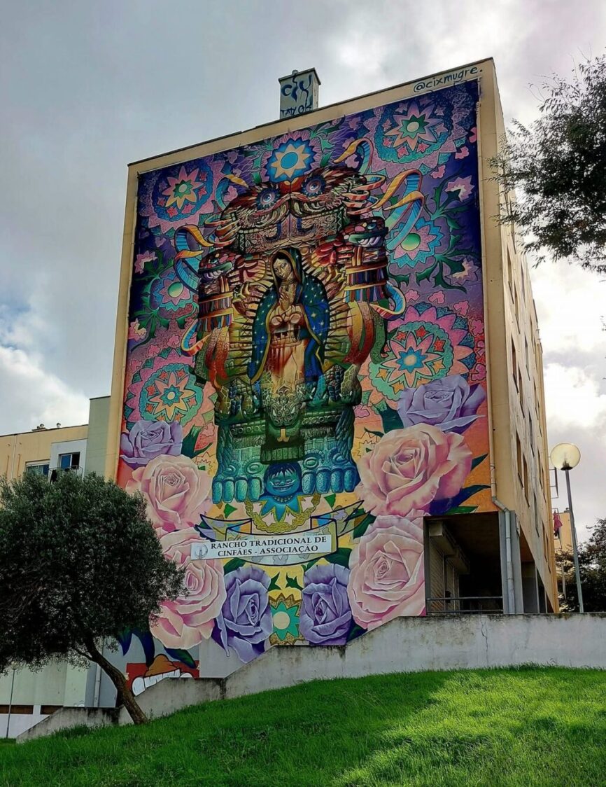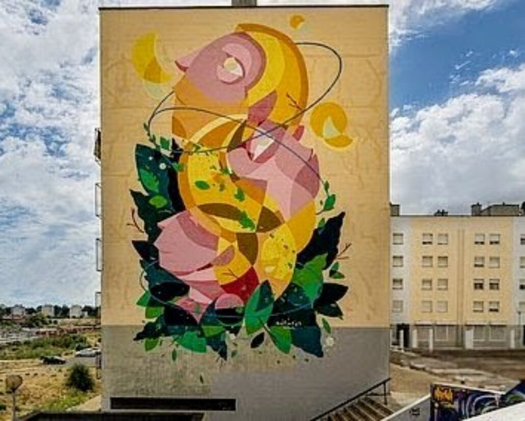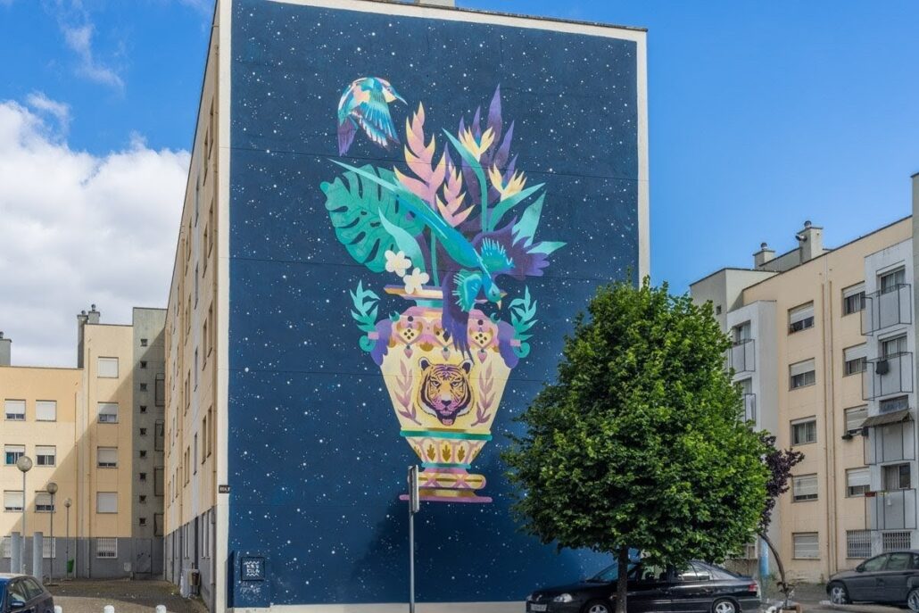 Kruella D’Enfer est une artiste portugaise qui transforme murs et toiles en univers fantastiques peuplés de créatures et de symboles poétiques. Cette murale déploie un bouquet de fleurs colorées inspiré des motifs ibéro‑américains sur un fond bleu profond, évoquant un ciel étoilé : une véritable offrande visuelle à la ville. Par son traitement poétique et onirique des formes et des couleurs, l’œuvre incarne l’esthétique unique de l’artiste, mêlant symbolisme culturel et émotion urbaine