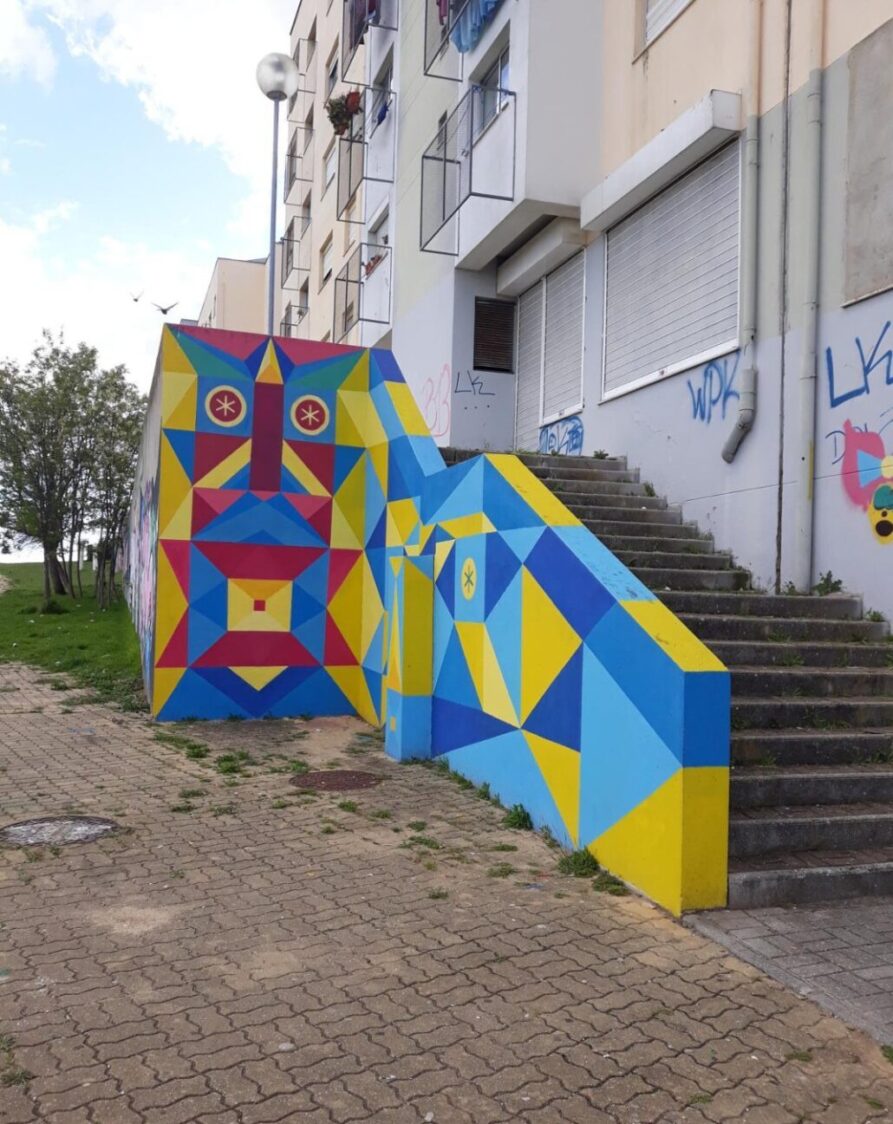 Hazul est un street-artiste portugais originaire de Porto. Actif depuis la fin des années 1990, il développe un univers graphique singulier mêlant formes géométriques, symboles organiques et compositions abstraites. Son travail, à la fois poétique et architectural, s’inscrit durablement dans le paysage urbain portugais et au-delà. Influencé par le cubisme et le surréalisme, Hazul joue avec les lignes droites et courbes dans une composition dominée par le bleu.