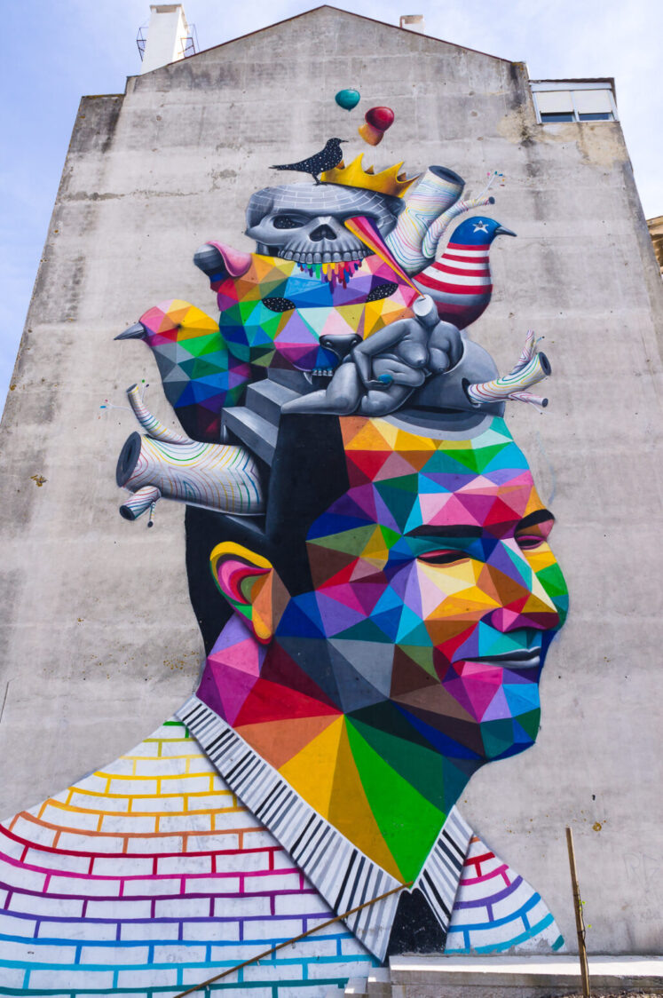 Okuda San Miguel, artiste espagnol né en 1980 à Santander, transforme les murs du monde entier en véritables explosions de couleurs et de formes géométriques. Ses fresques mêlent pop-art, surréalisme et figures squelettiques ou animales, créant un univers à la fois joyeux et philosophique. Chaque œuvre est une invitation à observer la dualité de la vie, entre nature et société, rêve et réalité, le tout avec un style immédiatement reconnaissable et résolument vibrant.