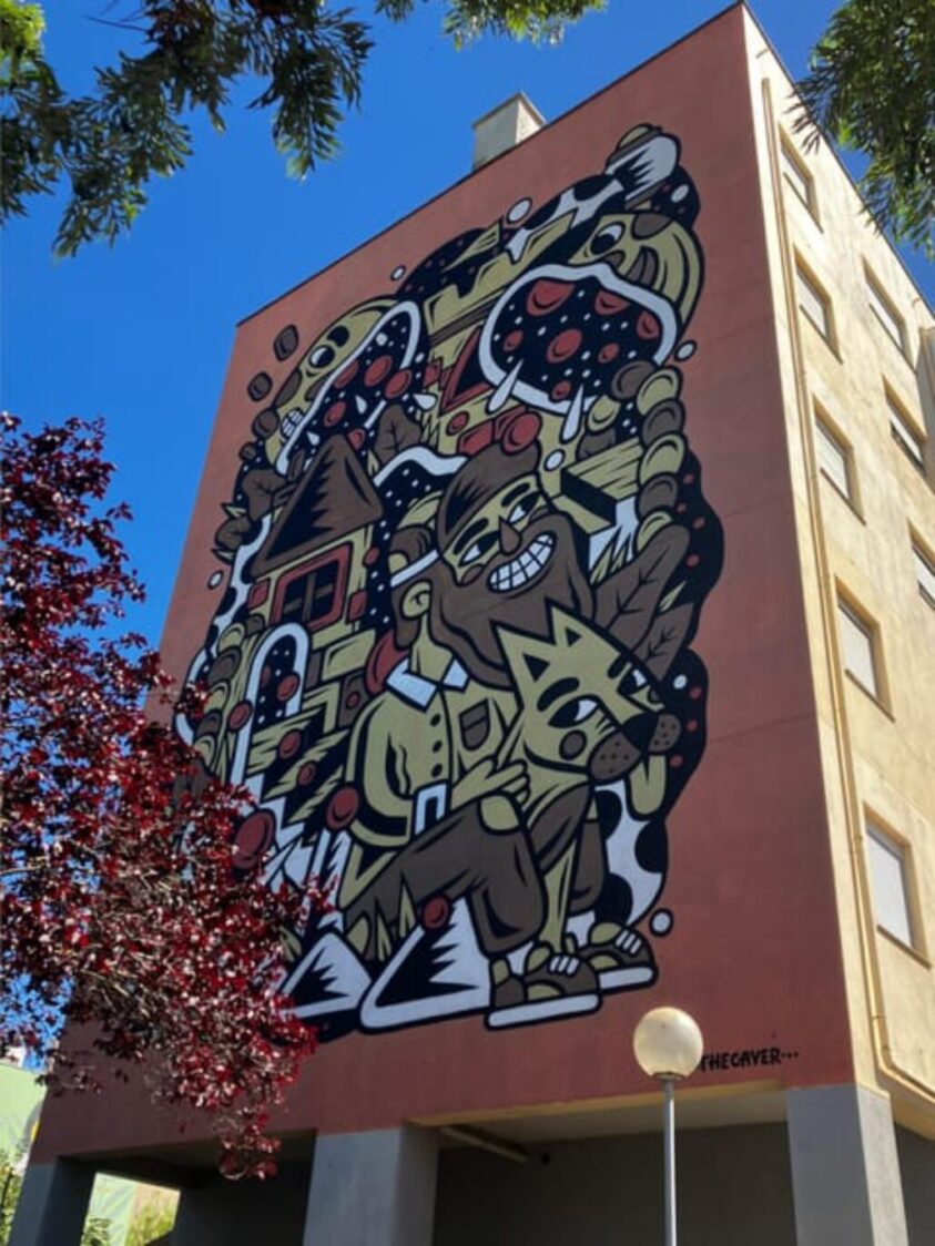 The Caver est un illustrateur et tatoueur lisboète dont le travail explore des thèmes universels avec humour et sensibilité. Dans une fresque commandée par la bière Super Bock, il célèbre l’amitié authentique, transformant le mur en un hommage vivant aux liens humains et à la convivialité.