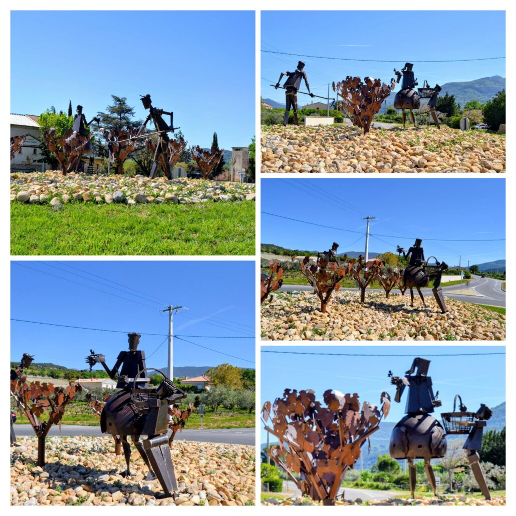 Sur la route départementale D94 à Vinsobres, le Rond-Point du Sagittaire se signale à l’œil du voyageur non seulement par sa fonction routière, mais surtout par son décor singulier. Installé et décoré à l’initiative du comité des vignerons du cru — pour rappeler l’attachement local à la vigne et au terroir — ce rond-point abrite trois grandes sculptures en métal représentant une scène champêtre animée : un homme maniant une houe, une femme cueillant une grappe, et un enfant recueillant fiévreusement le fruit de la vigne. L’artiste ardéchois Pierre-Louis Chipon, sollicité pour l’occasion, a assemblé ces figures à partir de pièces agricoles usagées, soudures et découpes donnant vie à une scène qui célèbre la viticulture tout en détournant, avec humour et poésie, les matériaux du quotidien. Entourés de plants de vigne intégrés à la composition, ces personnages métalliques incarnent une vision artistique modeste mais attachante.
