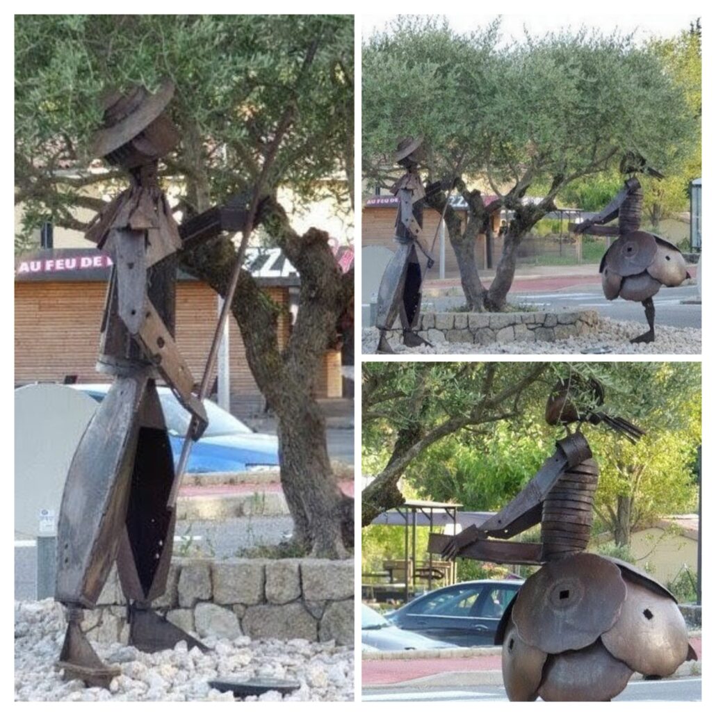 Sur la route d’Ardèche, à Saint-Sernin, un rond-point a troqué la grisaille du bitume contre une petite scène champêtre sculptée, un brin rustique et délicieusement narrative. Là, au milieu des oliviers ardéchois, des figures en métal représentent un couple de cueilleurs d’olives — l’homme tend une perche, la femme recueille les fruits dans un plateau — rappelant par là même l’importance historique de l’oléiculture dans la région depuis le Moyen Âge. Cette œuvre joyeuse, façonnée par Pierre-Louis Chipon, artiste métallique bien connu des amateurs de ronds-points décorés (à Vinsobres il y a quelques années), rend hommage non seulement à un terroir mais à un geste partagé : celui de travailler la terre et d’en tirer l’huile qui fait la fierté des tables du Sud-Est. Ainsi, en traversant ce carrefour, on n’est plus seulement automobiliste : on devient spectateur d’un petit épisode de vie locale, figé dans l’acier, qui donne envie de ralentir — même si ce n’est que pour admirer la scène.
