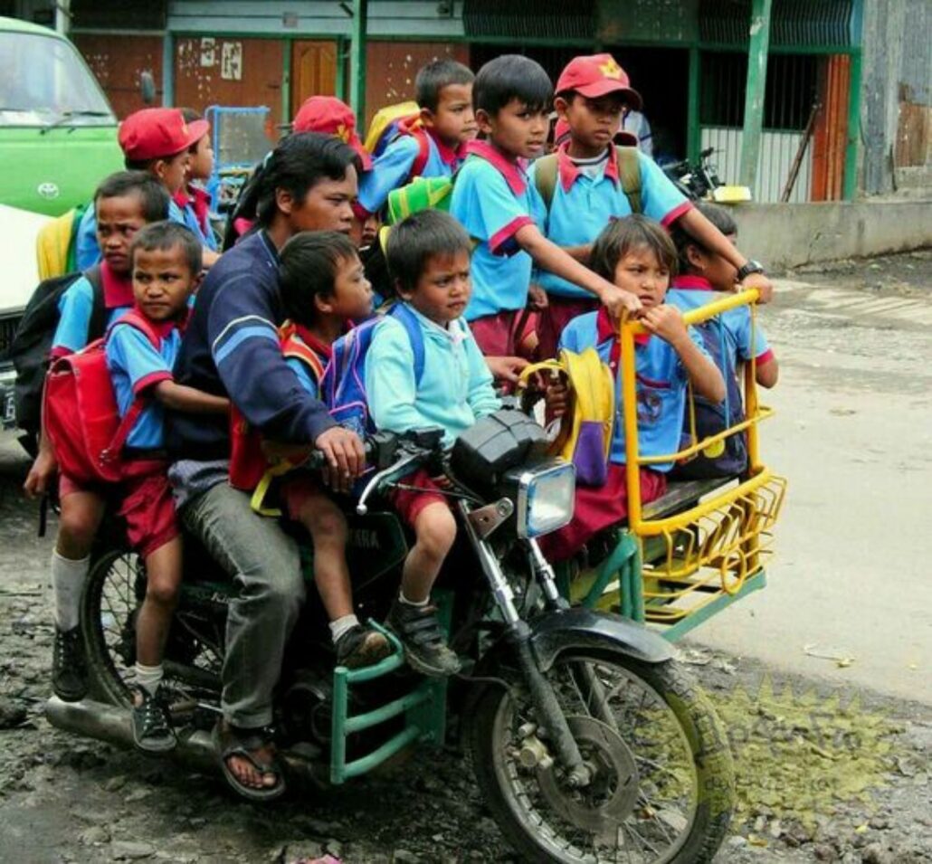 Il est des images qui frappent autant par leur absurdité que par la beauté de l’ingéniosité humaine. En voici une : un simple deux-roues transformé en véritable bus scolaire improvisé, capable de transporter non pas deux, mais une bonne quinzaine d’enfants, et parfois même davantage.