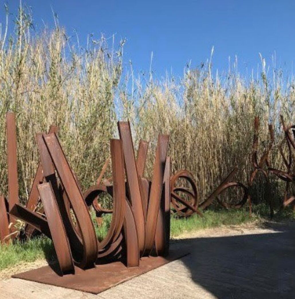 Habitué de cette route entre Narbonne et Narbonne-Plage, je ne m’attendais pas à ce que le paysage me surprenne. Pourtant, à l’entrée du Domaine de l’Hospitalet, un grand choc visuel attend le voyageur : une sculpture monumentale de Jean‑Pierre Rives, trônant là comme un gardien silencieux. Le métal brut, plié, torsadé, capte la lumière et défie la gravité, imposant à la fois force et poésie.