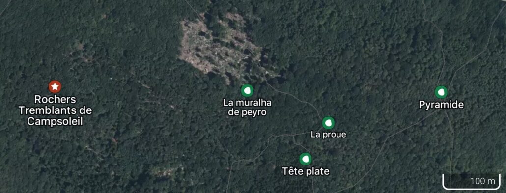 Le nom Campsoleil a des racines locales : il s’agit d’un lieu-dit autour de Burlats, connu pour ses étendues de granit et ses carrières historiques. Littéralement, “camp de soleil” évoque peut-être une clairière ensoleillée au milieu des rochers et des bois, ou un endroit où le granit, chauffé par le soleil, prend des reflets dorés. Quoi qu’il en soit, le nom a traversé les générations, et aujourd’hui, parler de la forêt de Campsoleil, c’est évoquer ces sous-bois mystérieux où la pierre et la végétation se mêlent, un petit coin du Sidobre hors du temps.
