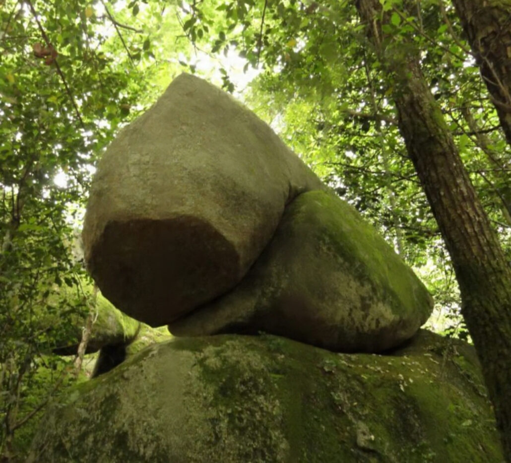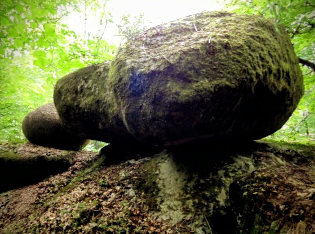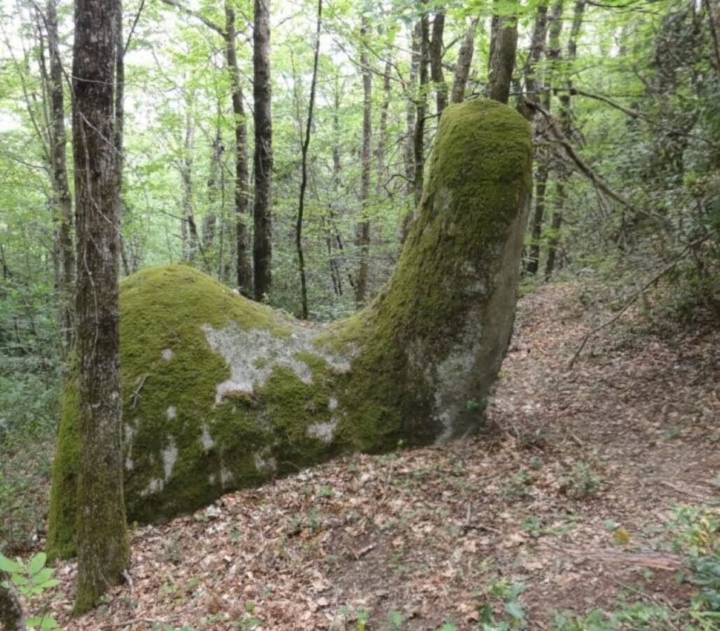 🔸Plus loin, la forêt se resserre, le deuxième rocher imposant surgit vite : le Tremblant de Nauzières. Massif, posé en équilibre comme si quelqu’un l’avait déposé là. On repense à ce qu’on connaît de lui, à Raymond Nauzières qui guidait les visiteurs jusqu’ici. Il a l’air immobile mais on devine qu’il pourrait bouger, juste un peu.