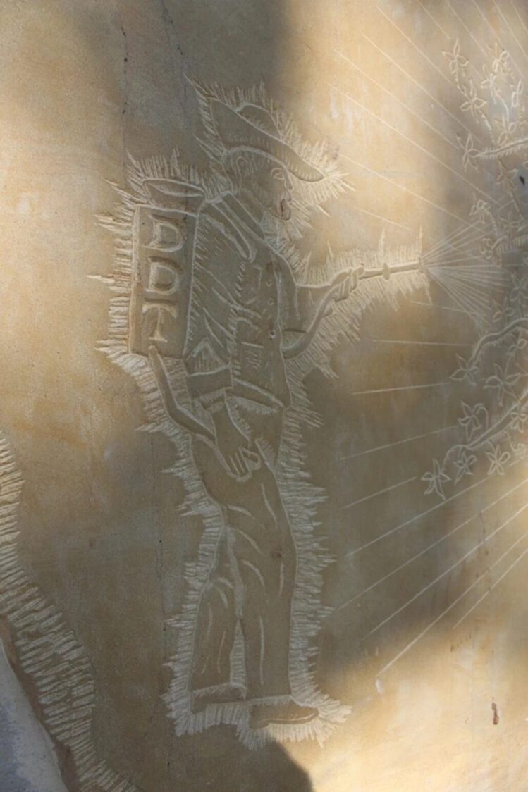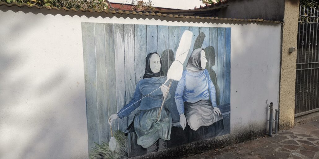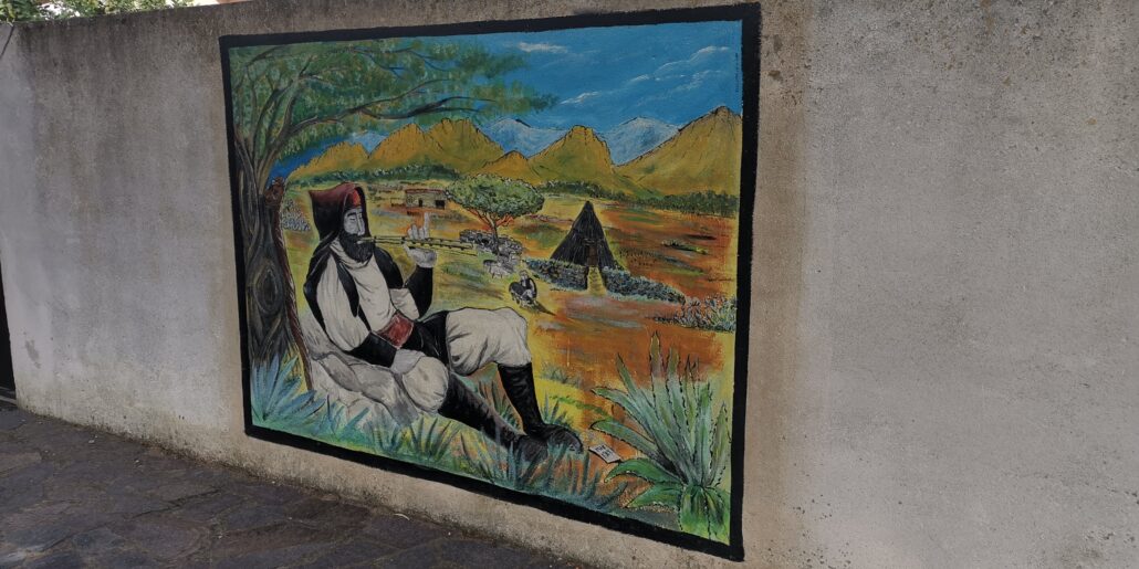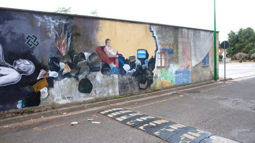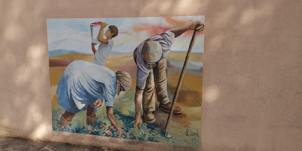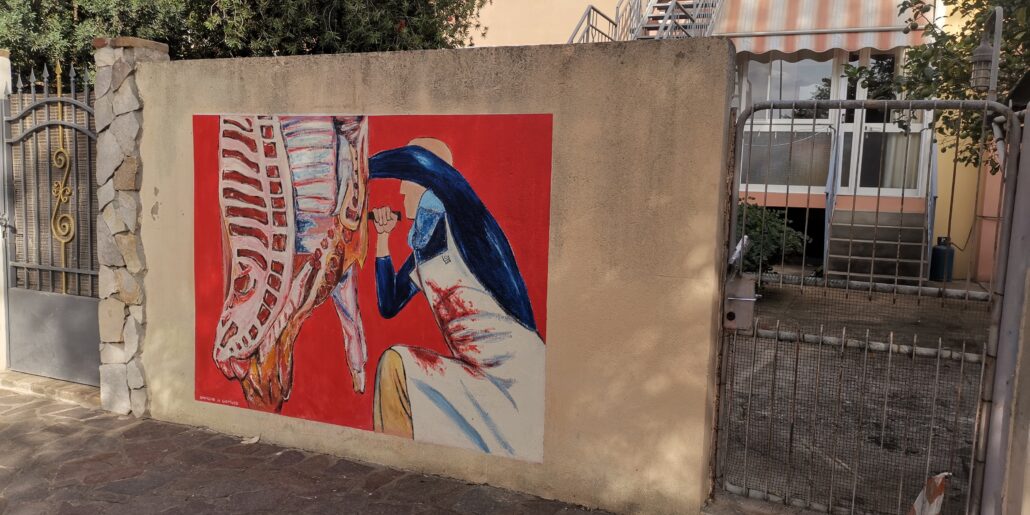 À l’époque, la jeunesse se mobilise — discussions, assemblées, pinceaux brandis comme des armes pacifiques… tout respire l’envie de transformer la société et de croire qu’un monde meilleur est possible. Mais l’élan finit par s’affaiblir. Tandis que San Sperate et Orgosolo font perdurer et renouveler leurs murales pour représenter la mémoire paysanne, les métiers d’autrefois, Serramanna, elle, laisse peu à peu ses fresques disparaître. Beaucoup sont recouvertes d’enduits, d’autres s’effacent avec le temps. Ce qui fut autrefois la fierté d’une communauté devient presque invisible