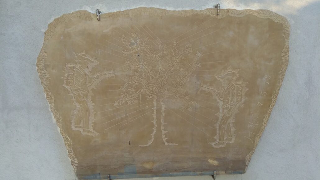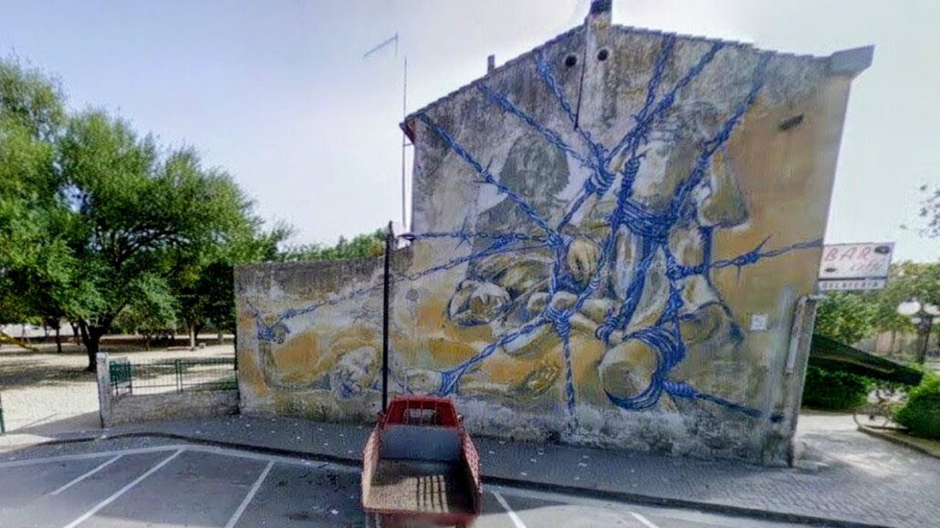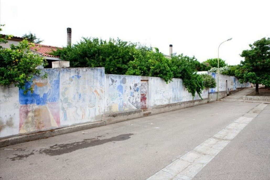 Le mur « Emigrazione è deportazione » (l’émigration est une déportation) — parfois aussi appelée “Murale degli incatenati” (le mur des enchaînés) réalisée par Antonio Ledda, Adriano Putzolu, Arba et Dessì. Elle se dresse encore, en ce mois d’octobre 2021, à l’entrée du village, sur le Viale Fra Ignazio, juste face à la route qui mène depuis Samassi. Impossible de la manquer : son message puissant frappe comme un coup de poing.