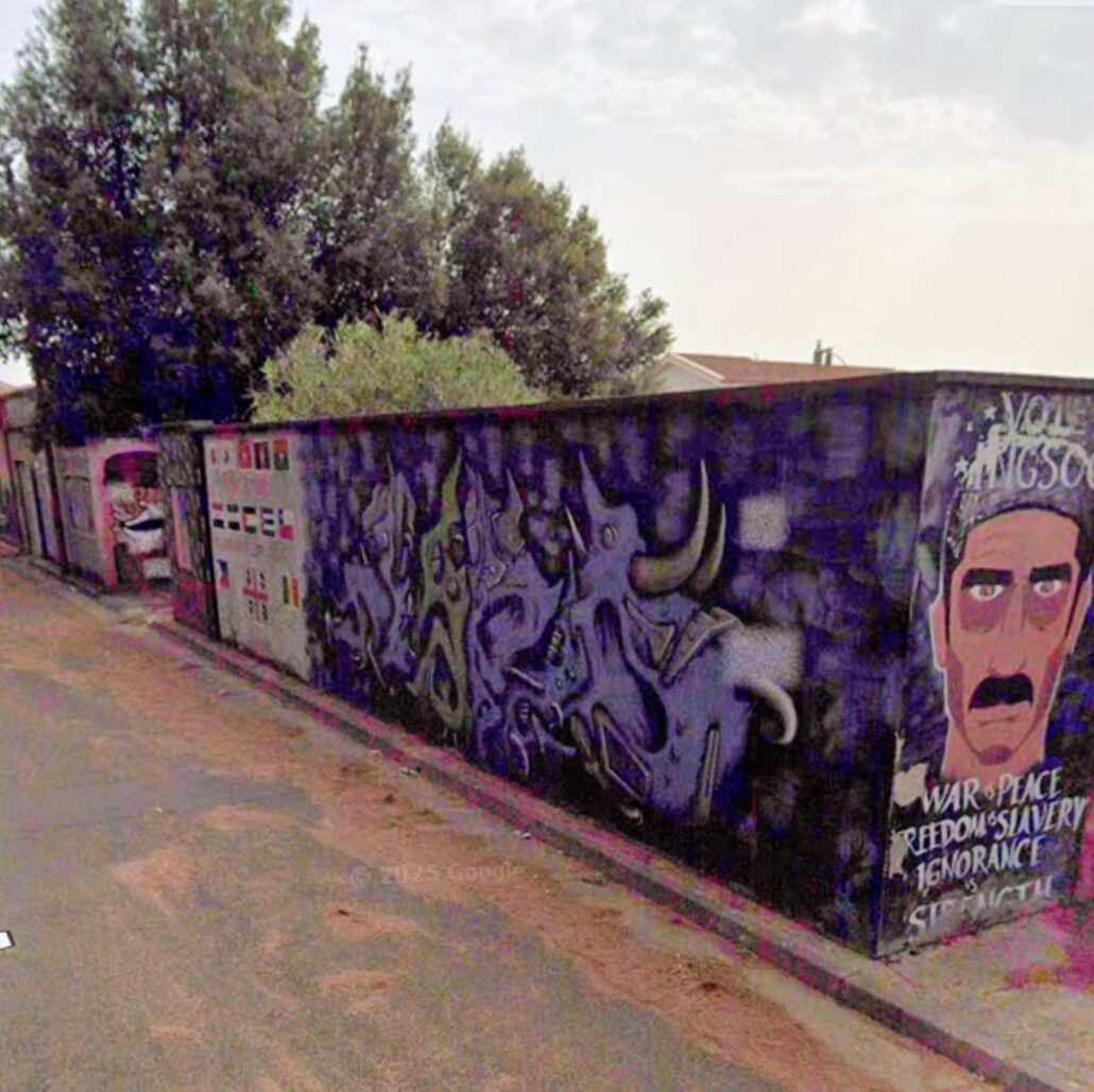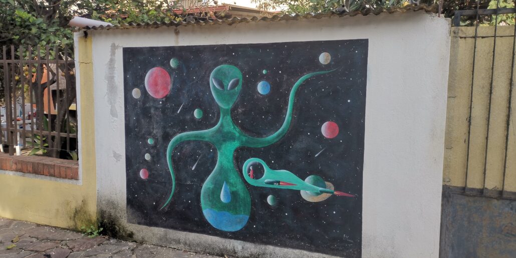 Après avoir parcouru les rues colorées de San Sperate, nous décidons de pousser notre curiosité un peu plus loin. La Sardaigne ne se limite pas à Orgosolo ou San Sperate lorsqu’on parle de peintures murales. Serramanna, un village discret de la plaine du Campidano, a elle aussi vécu un âge d’or muraliste — même si aujourd’hui, bien peu de visiteurs s’y arrêtent.