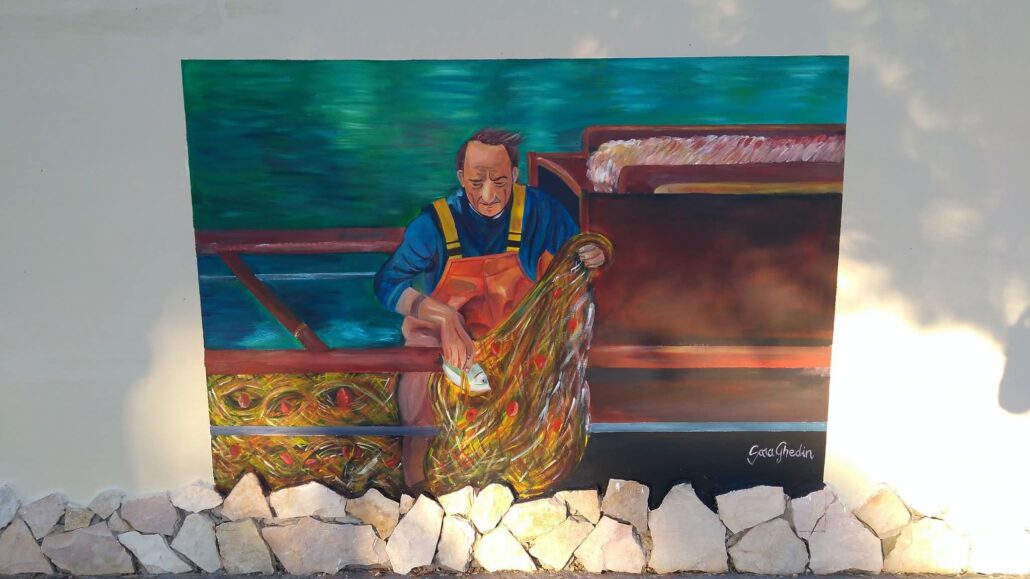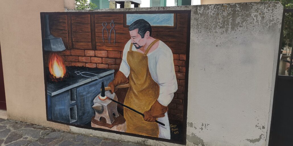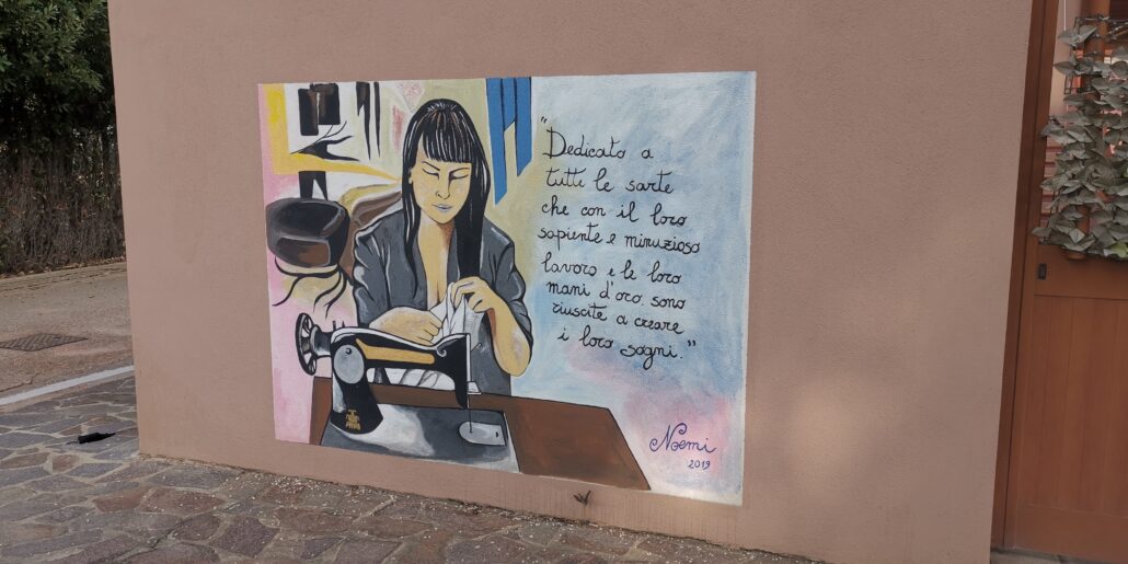 Fresque sur les anciens métiers sur le mur latéral du siège de la Société des travailleurs de Serramanna , réalisée par l’artiste Marina Putzolu , professeur au lycée d’art de Cagliari.