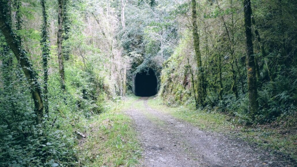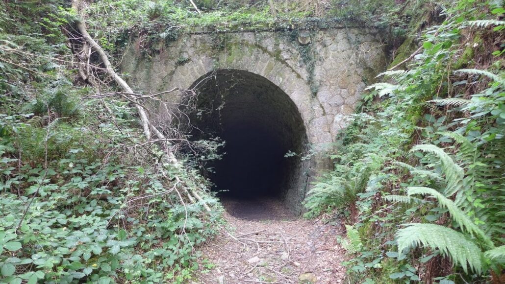 Le tunnel de Teillède s’ouvre devant nous, sombre et silencieux, comme une bouche béante dans la roche.
