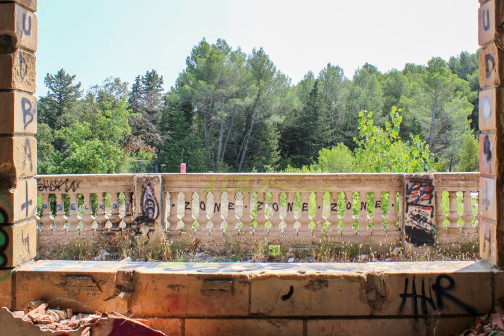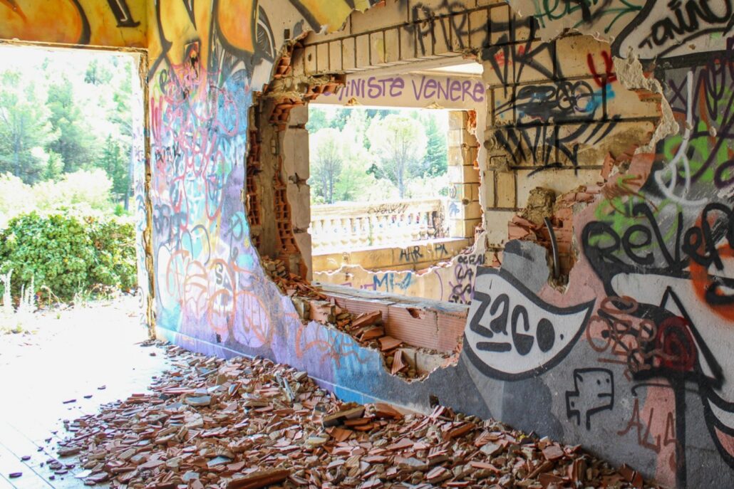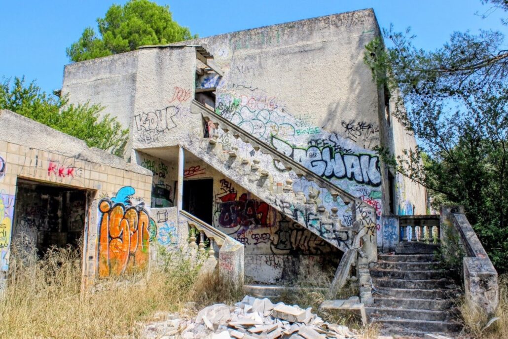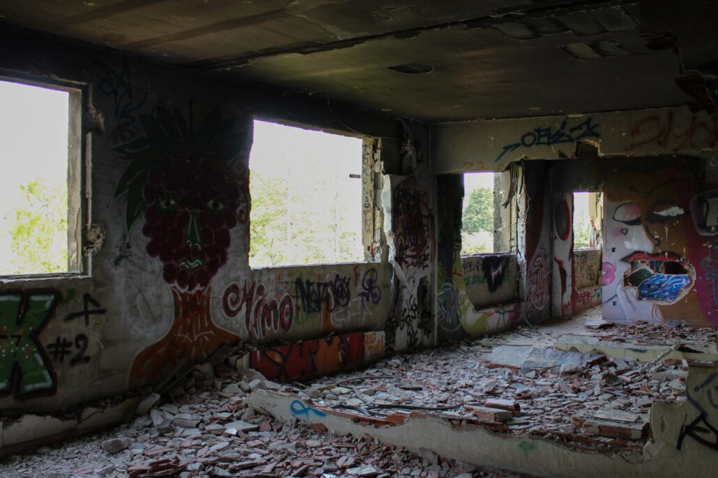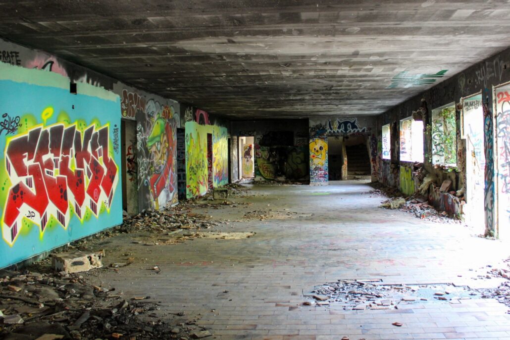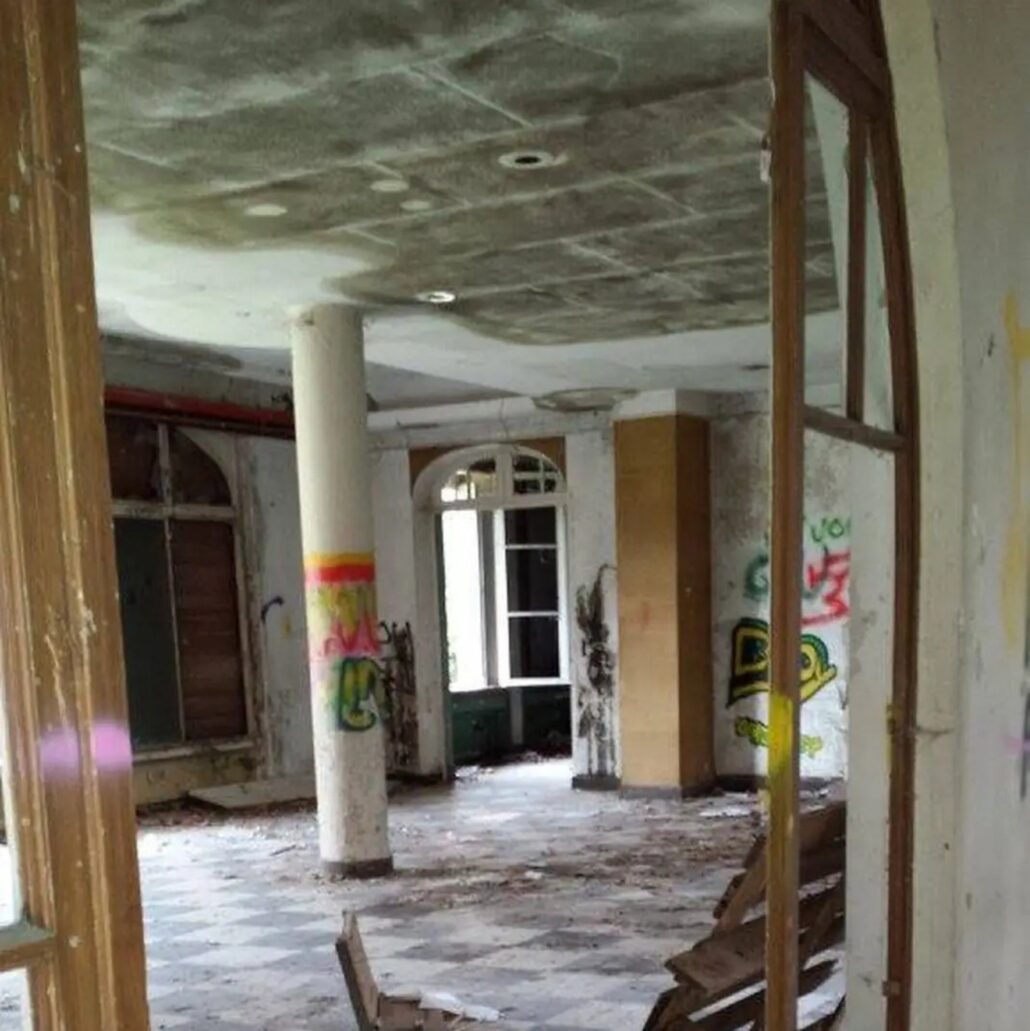 La salle principale, aujourd’hui taguée et dévastée, garde encore quelque chose de sa noblesse passée.