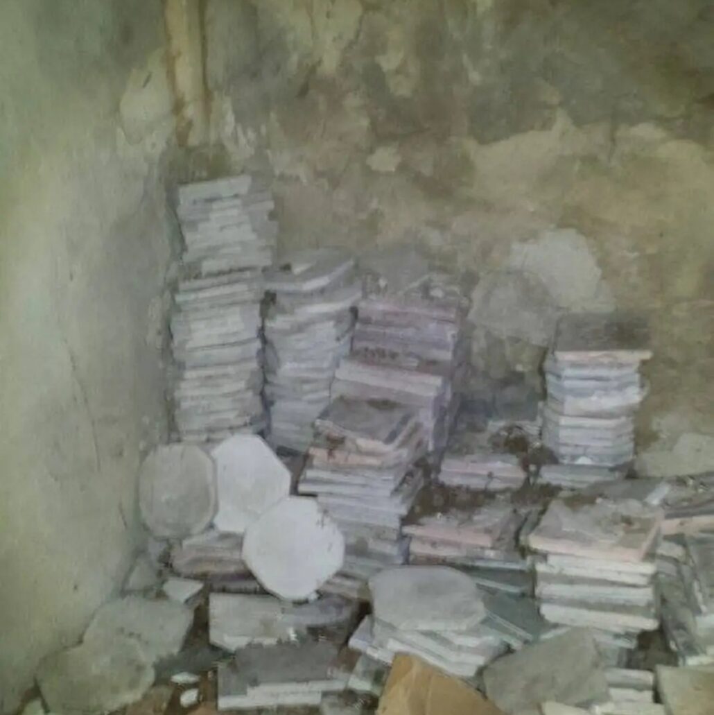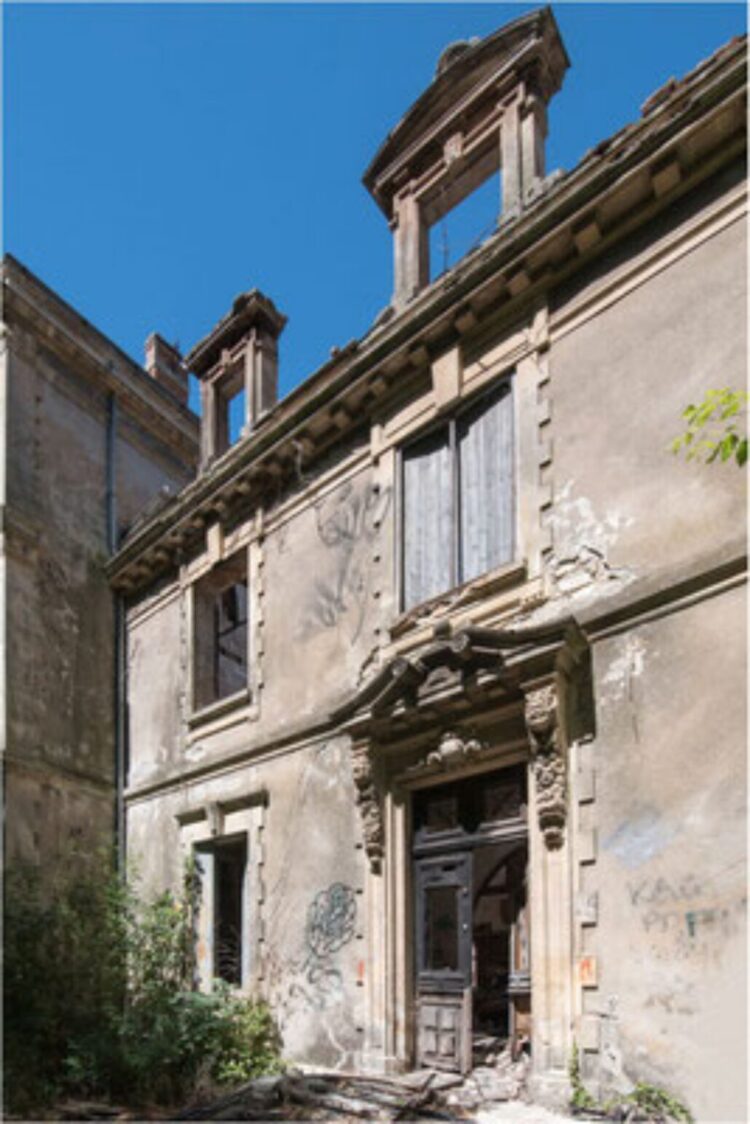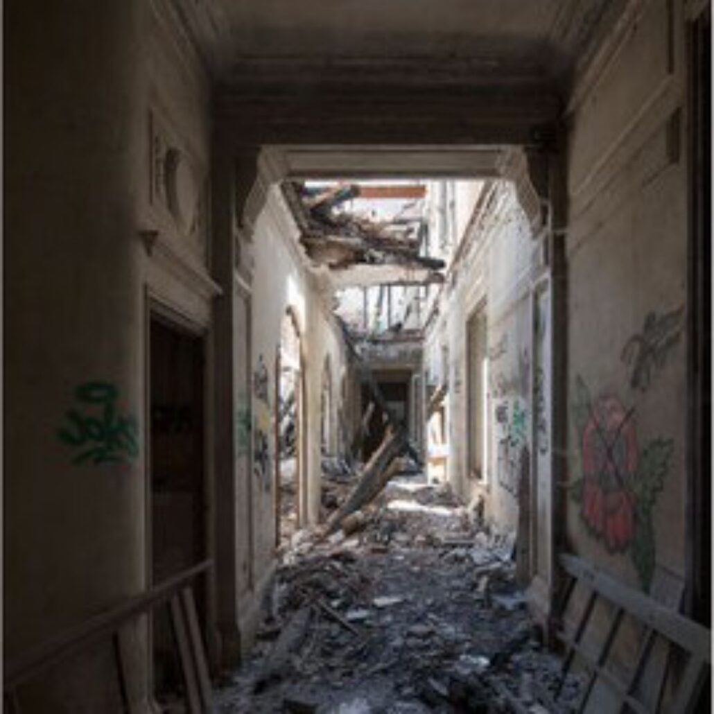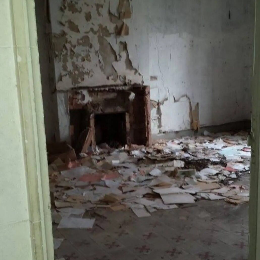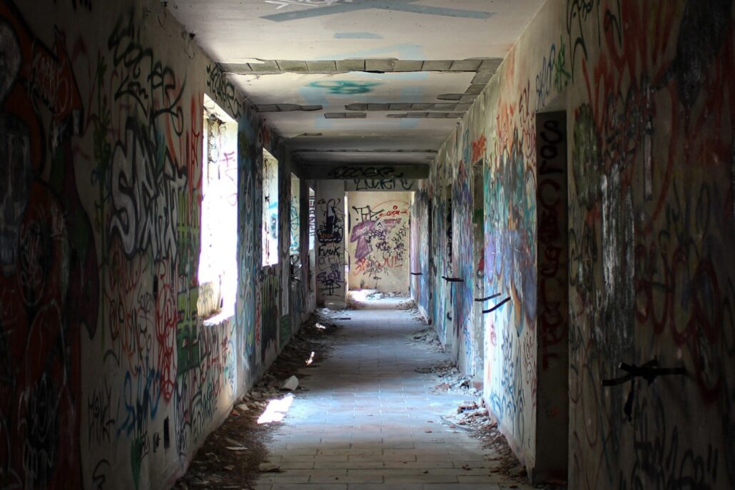 La salle principale, aujourd’hui taguée et dévastée, garde encore quelque chose de sa noblesse passée.